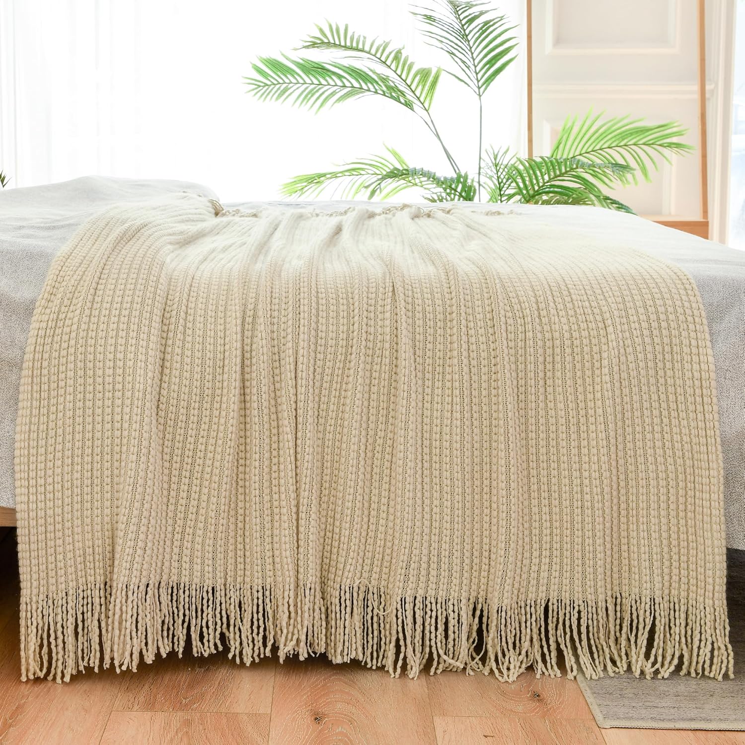 Blagic Knitted Throw Blanket for Couch,Soft Farmhouse Boho Fall Throw Blanket with Tassels,Home Decorative Lightweight Throw Blankets,Beige Throws for Bed/Chair/Sofa, 60" W x 80" L
