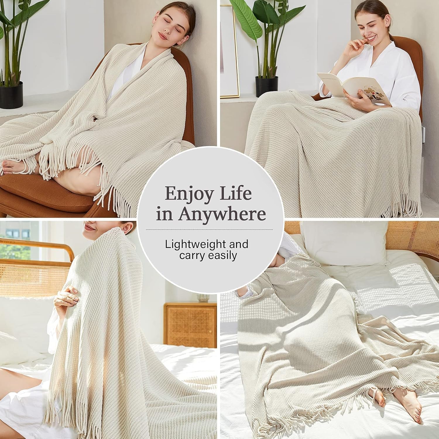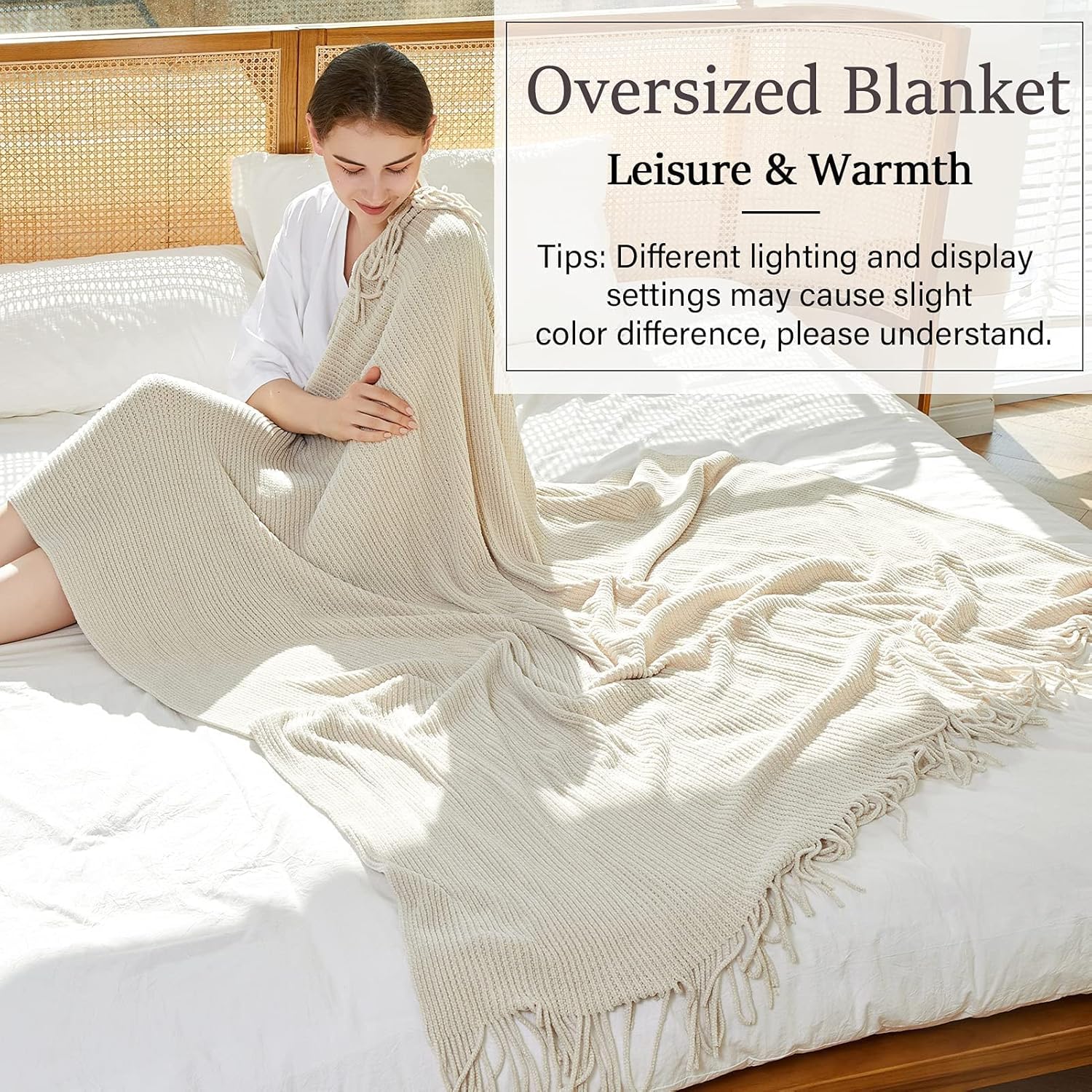 Blagic Knitted Throw Blanket for Couch Soft Farmhouse Boho Throw Blanket with Tassels Home Decorative Lightweight Throw Blankets,Cream White Throws for Bed/Chair/Sofa, Stripe Textured, 60" W x 80" L