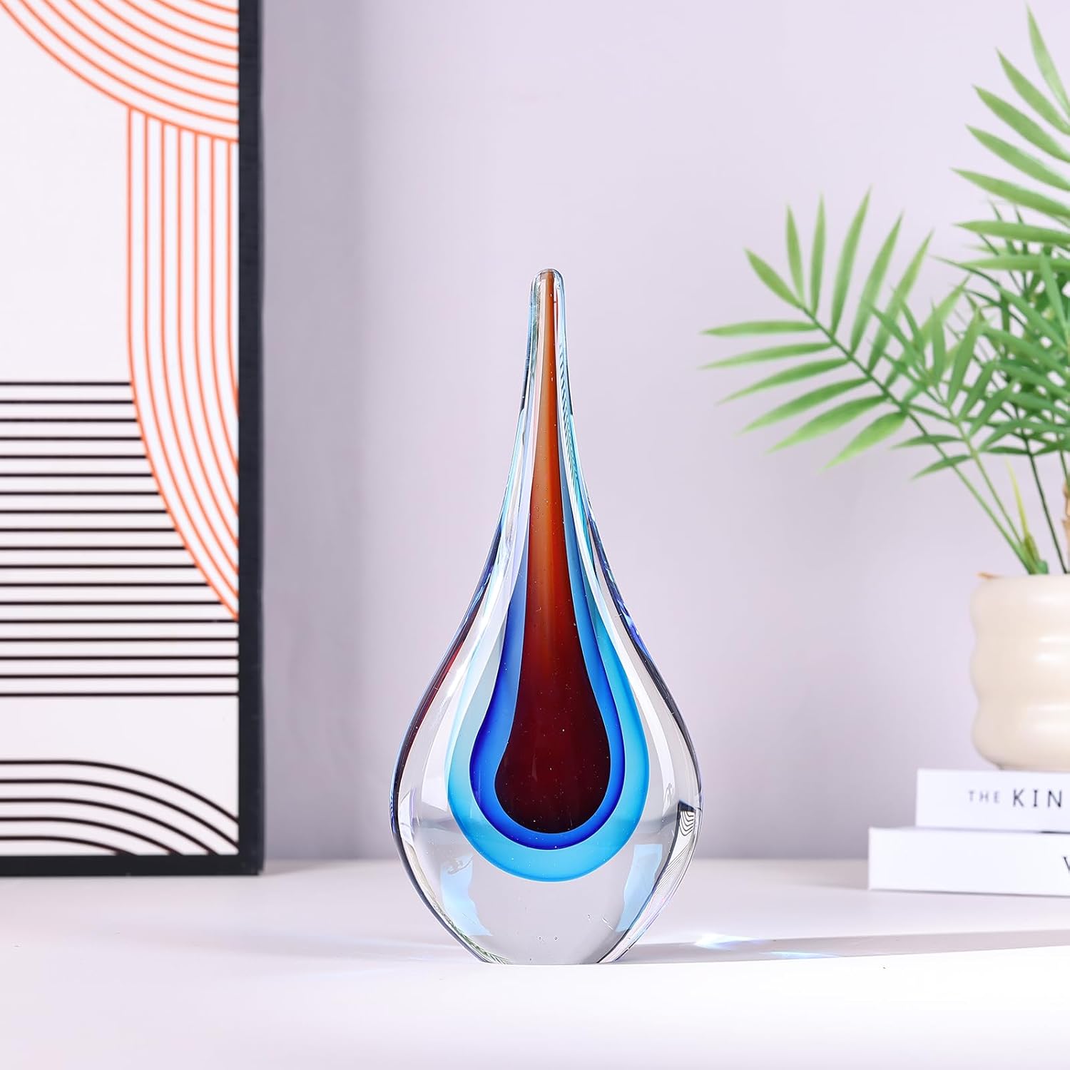 DOVDOV Blown Glass Sculpture, Blue and Brown Glass Art Teardrop Statue, Unique Ocean Theme Decoration for Office, Bookshelf, Dresser, Living Room Coffee Table, Fireplace countertop Decoration.