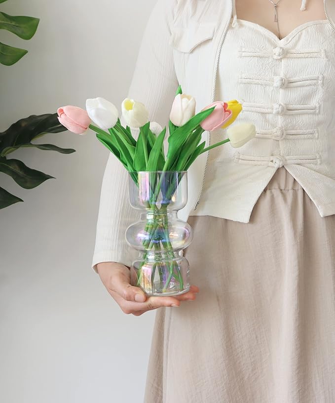JSPYFITS Glass Hydroponic Flower Vase, 7 Inches Colored Glasses Bubble Vase for Flower, Three-Layer Glass Funky Vases for Home/Office/Weddings/Party Table Flowers Decor (Iridescent Clear)