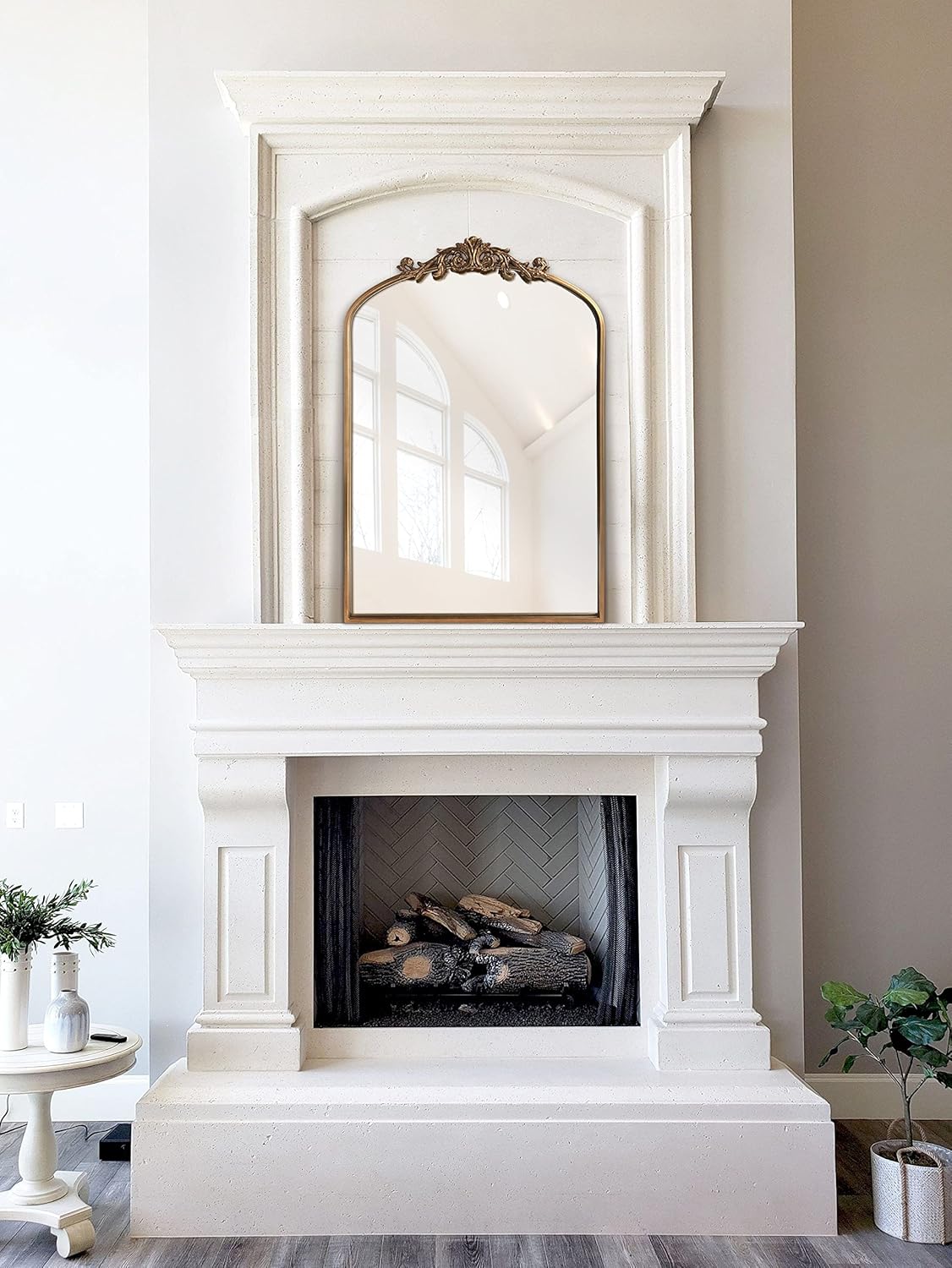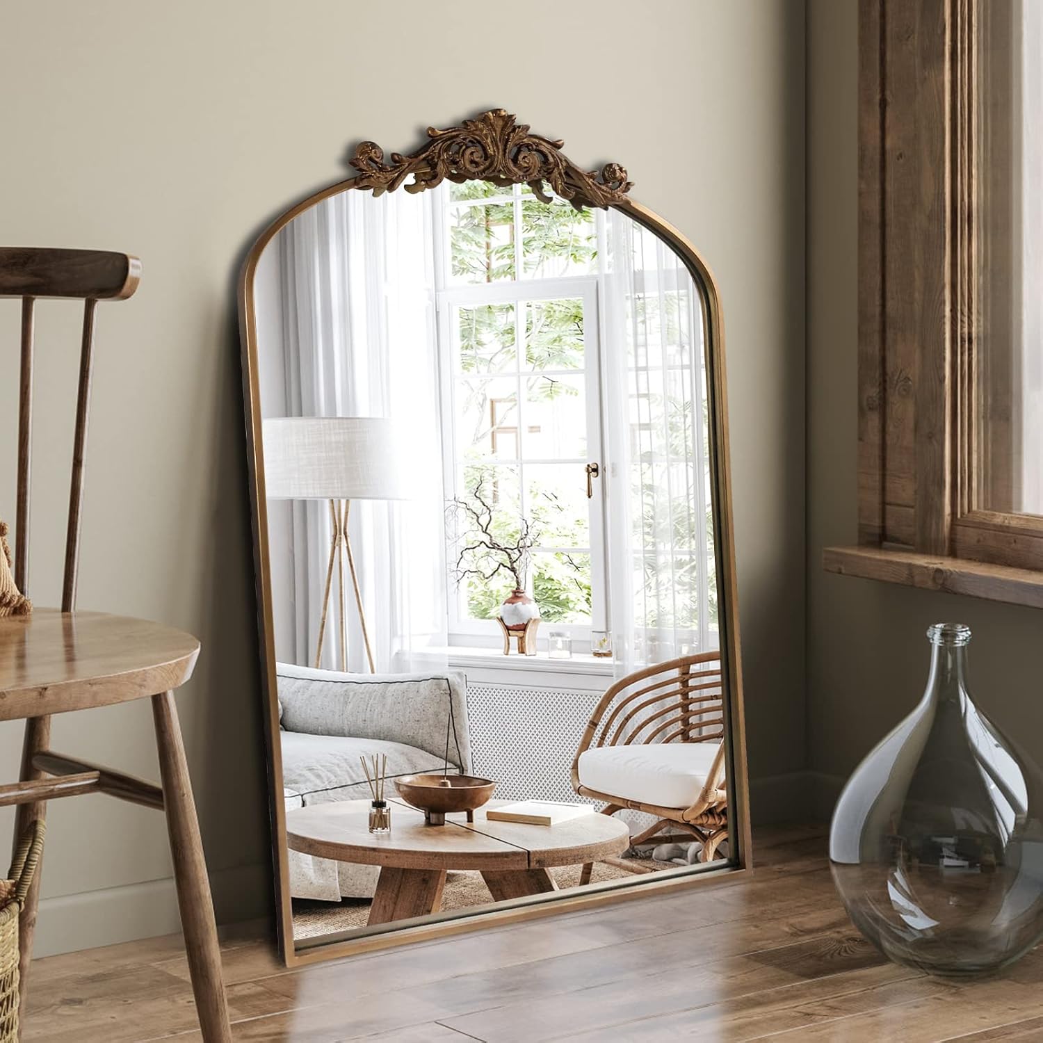 Gold Brass Mirror for Wall,Gold Traditional Vintage Ornate Baroque Mirrors,Victorian Antique Bronze Mirrors with Full Matel Frame,Arched Mirror for Entryway/Bathroom/Fireplace 24"X36"