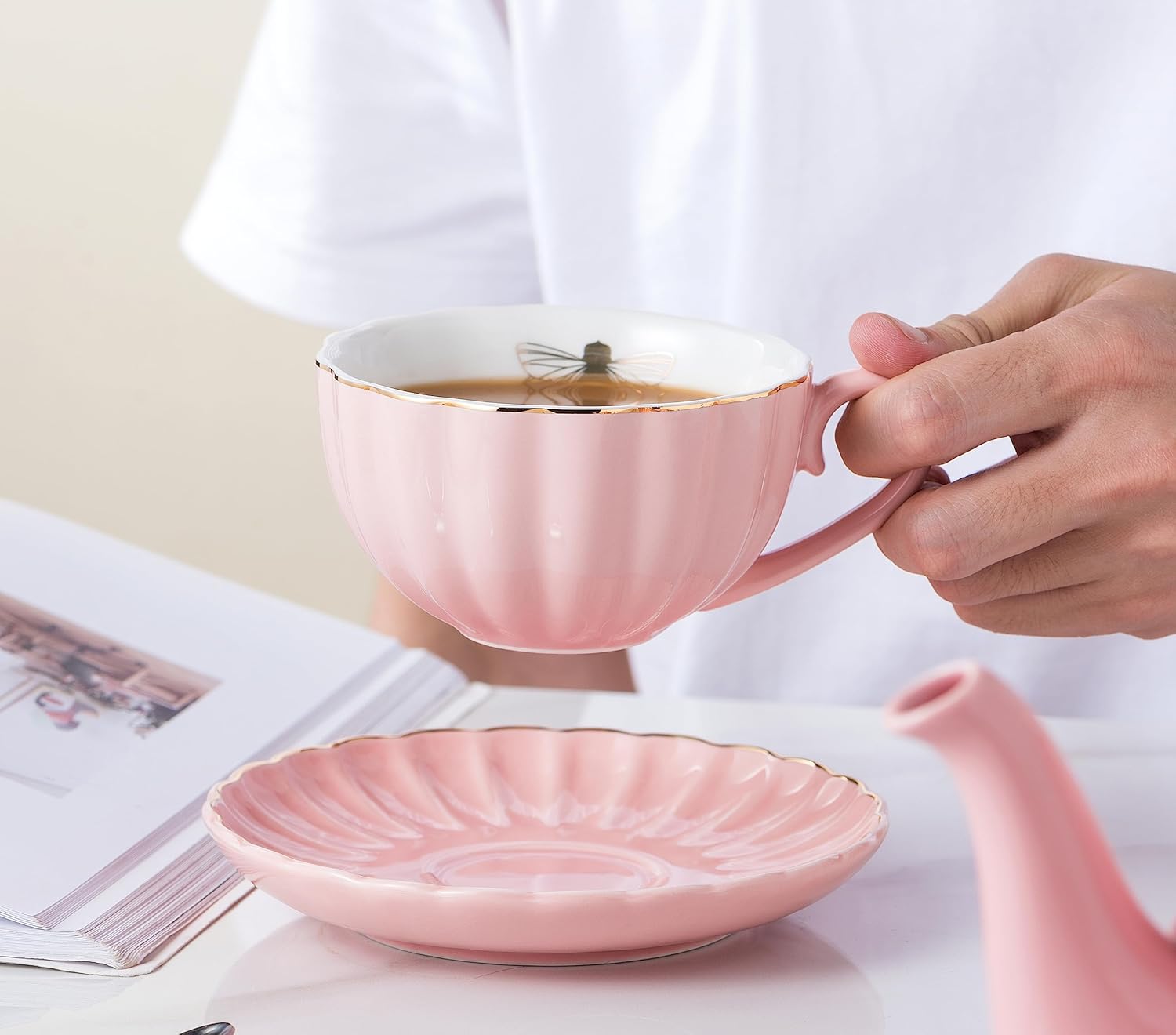 CLAY TONIC-- 8 OZ Fine China Purple Coffee Cup/Teacup Set, Cups & Saucer, with Teapot-Sugar Bowl-Cream Pitcher Teaspoons and tea strainer for Tea/Coffee,17-Pieces- Service for 4 (Pink)