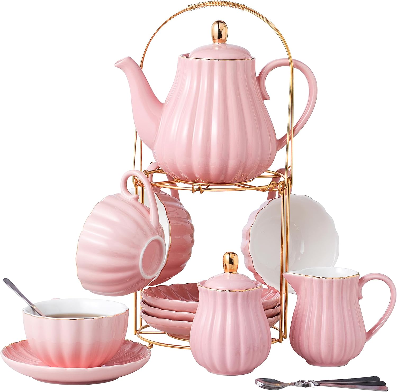 - 【WHAT"S INCLUDED】: 4 tea cups,4 saucers,4 teaspoons, a teapot, and a sugar bowl, a cream pitcher(Display Stand is INCLUDED)