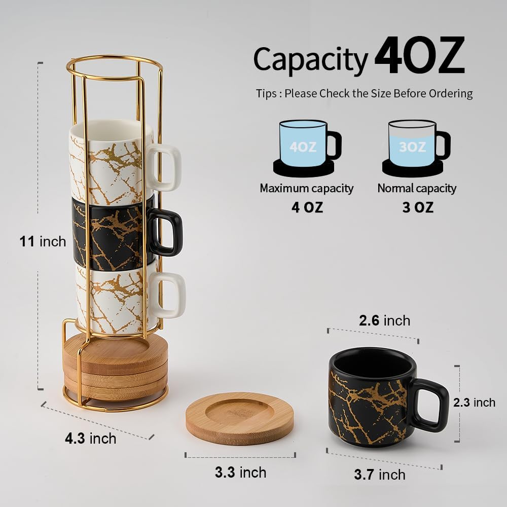 LUKA Porcelain Espresso Cup with Saucer and Metal Stand, 4 Ounce Stackable Ceramic Demitasse Espresso Mugs Cups Set for Latte, Specialty Coffee Drinks, Cafe Mocha - Set of 4, White & Black