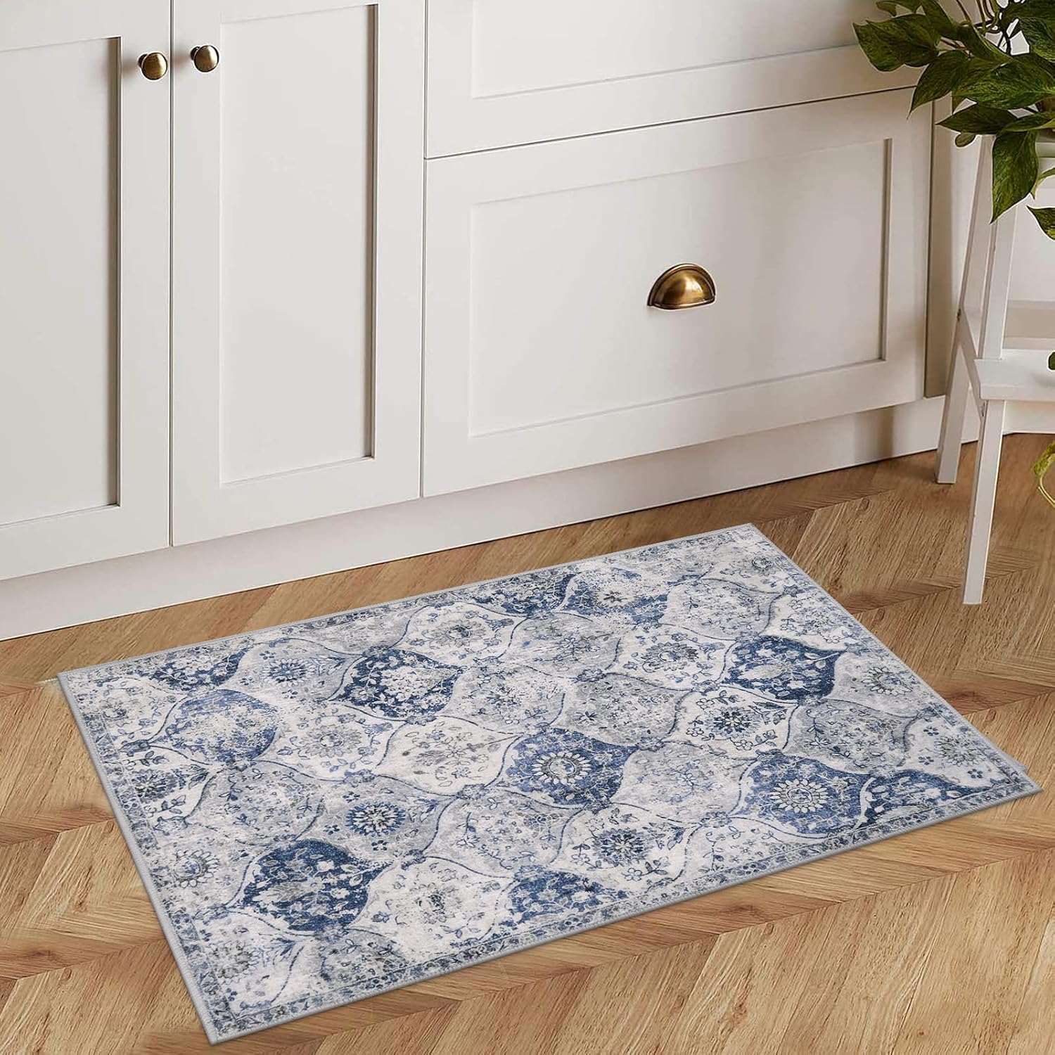 Lahome Moroccan Trellis Washable Rug, 2x3 Kitchen Rugs for Entryway Bathroom, Non-Slip Indoor Door Mat Ultra-Thin, Small Oriental Throw Carpet for Bedroom Entry, White/Royal Blue