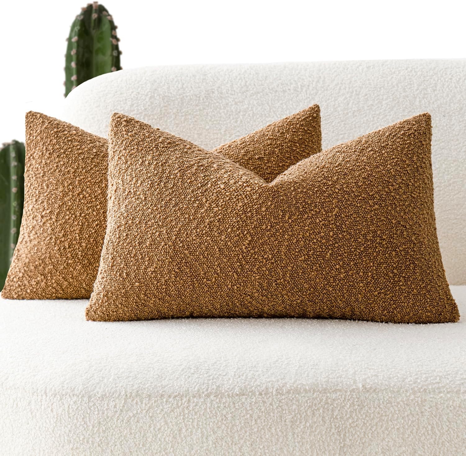 Foindtower Pack of 2 Textured Boucle Throw Pillow Covers Accent Solid Lumbar Pillow Cases Cozy Soft Decorative Couch Cushion Case for Chair Sofa Bedroom Living Room Home Decor, 12 x 20 Inch,Tobacco