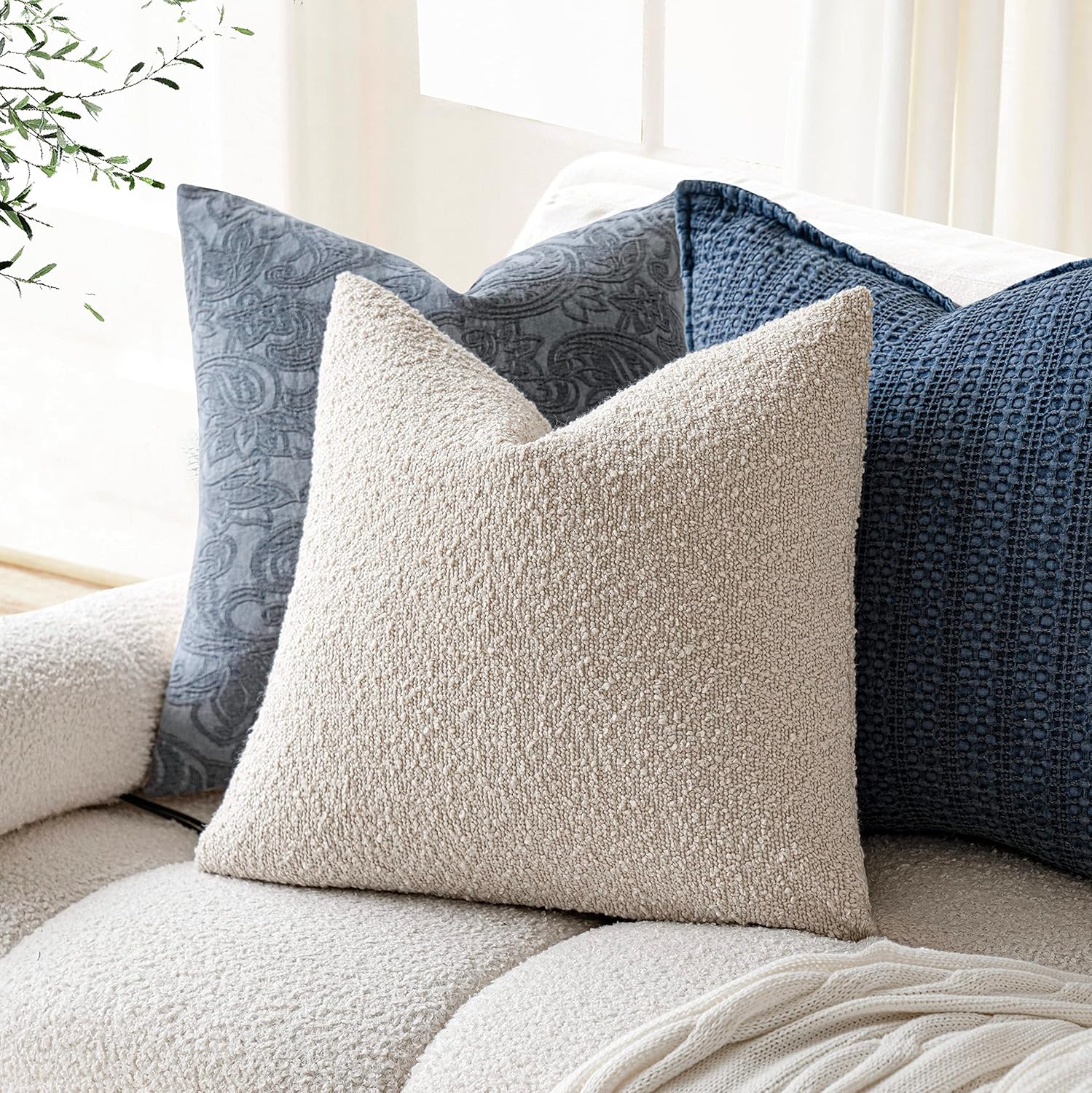Foindtower Pack of 2 Textured Boucle Throw Pillow Covers Accent Solid Pillow Cases Cozy Soft Decorative Couch Cushion Case for Chair Sofa Bedroom Living Room Home Decor, 18 x 18 Inch,Neutral Ivory