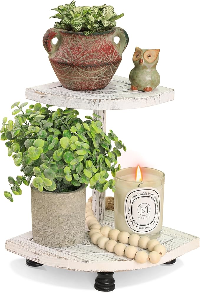 Tikea Decorative Wood Riser for Display, 2-Tier Farmhouse Corner Shelf for Kitchen Bathroom Counter Decor, Farmhouse Riser for Soap Dispenser, Decorations and Plant (White)