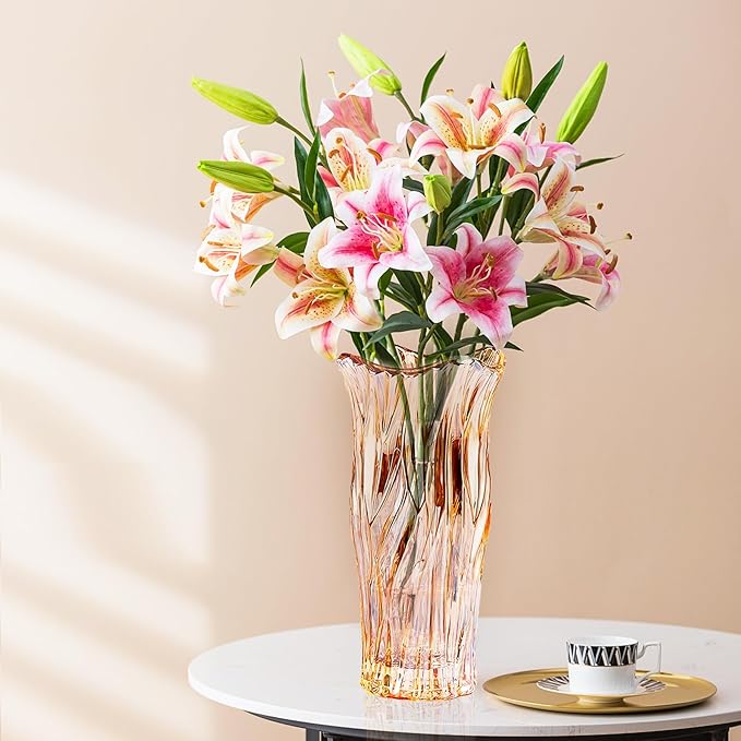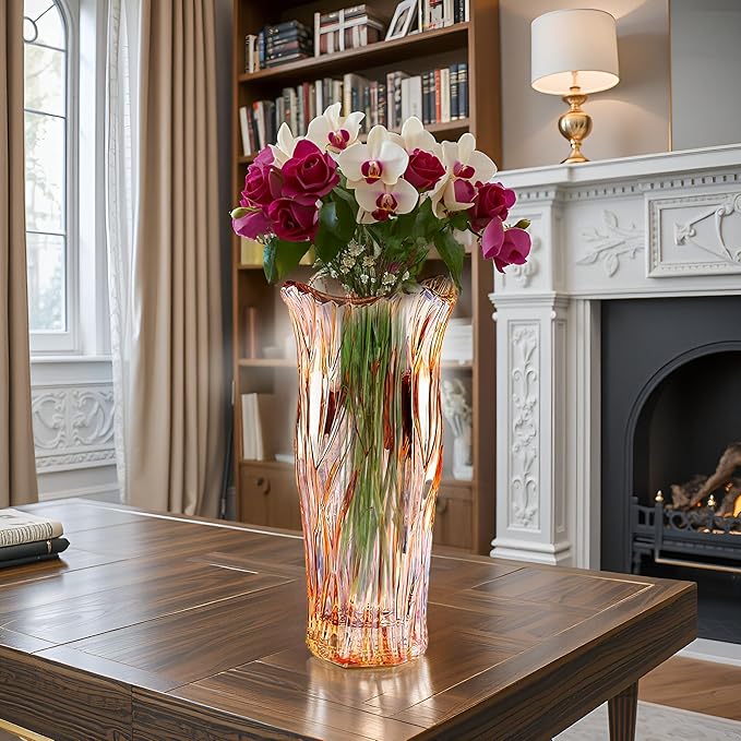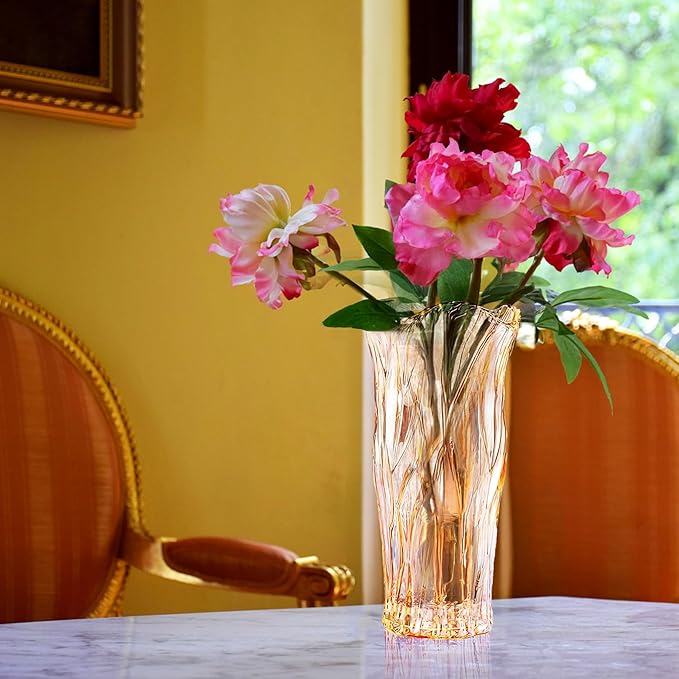 Glass Vase for Flowers, Gold Amber Clear Glass Vases for Centerpieces, Crystal Vase for Home Table Flower Decor 9.1 inches Tall