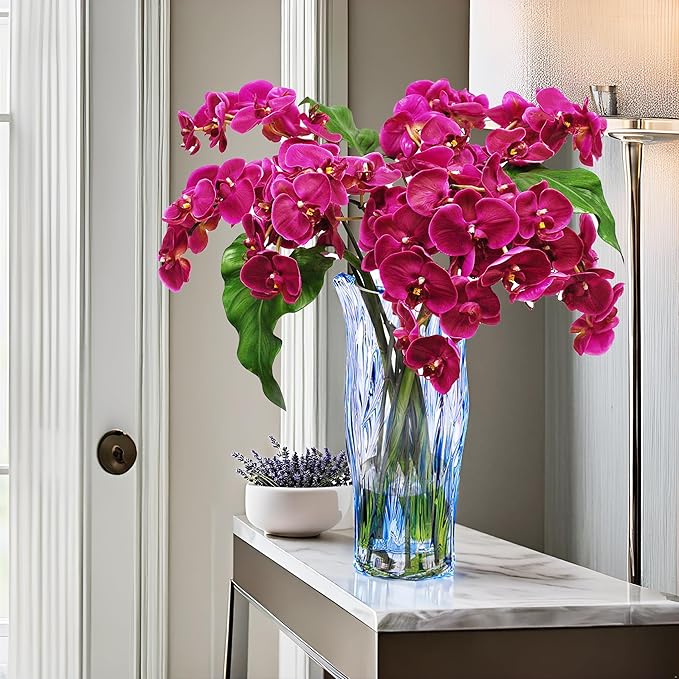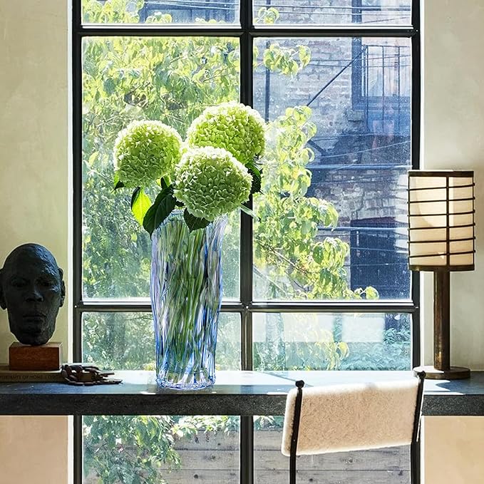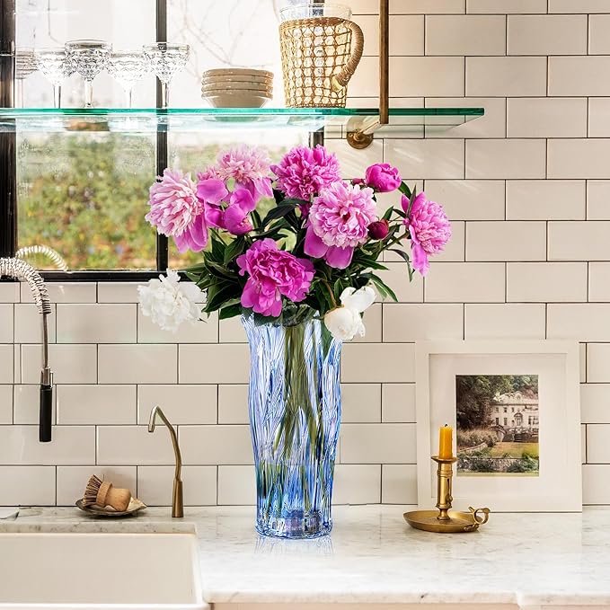 Glass Vase for Flowers, Blue Clear Glass Vases for Centerpieces, Crystal Vase for Home Table Flower Decor 9.1 inches Tall