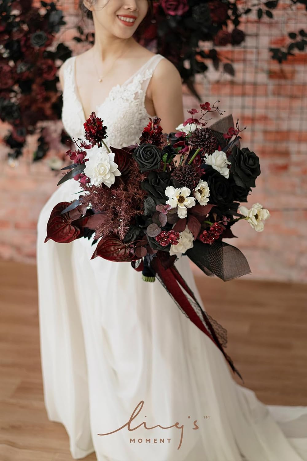 Ling's moment Black and Burgundy Wedding Bouquets for Bride, Gothic Bridal Bouquets for Bride, 15 Inch Free Form Artificial Wedding Flower Bouquet