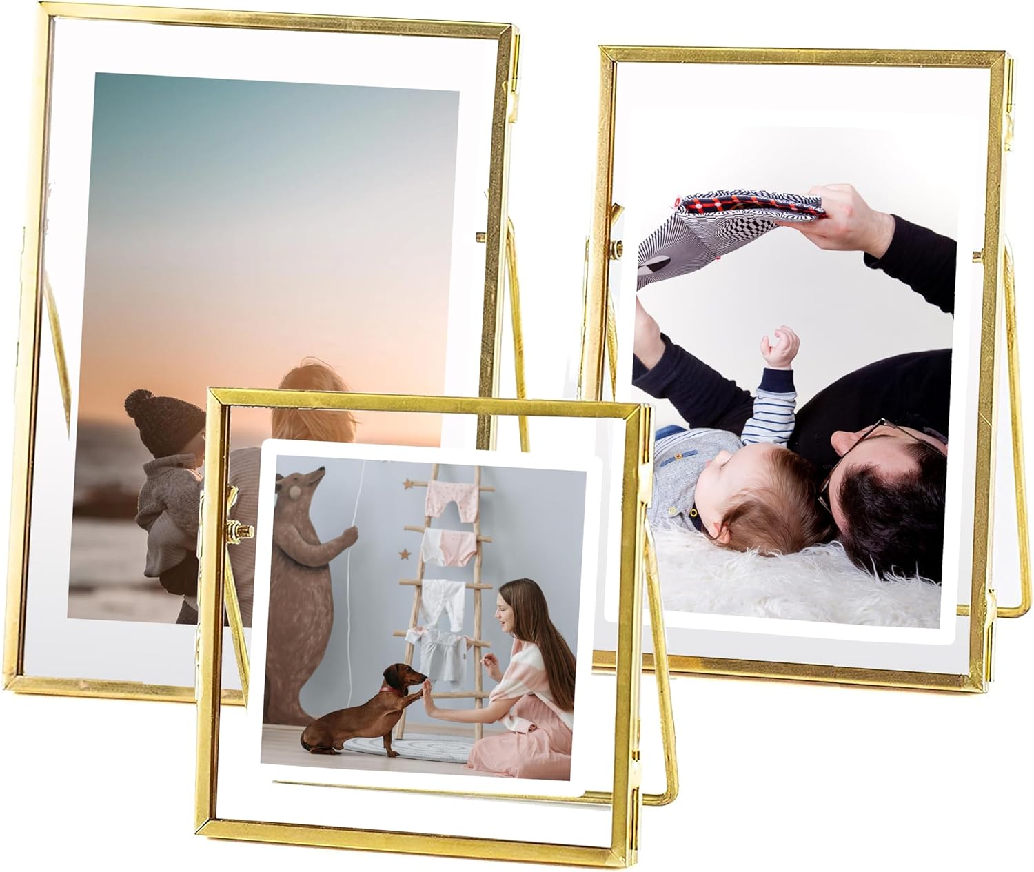 Gold Picture Frame - 4x6 Antique Brass Postcard Picture Frame for Desk - Small Pressed Glass Frame for Pressed Flowers - Floating Vertical (3 different sizes (4 * 4, 4 * 6, 5 * 7))