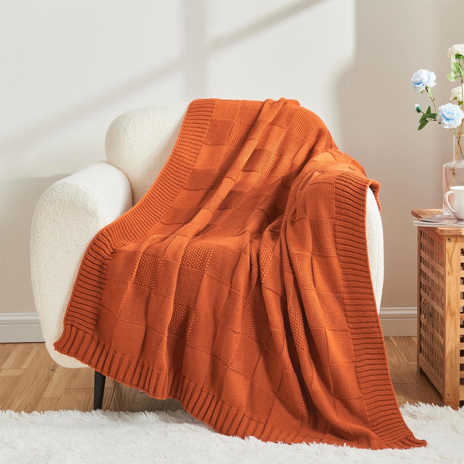 - DESIGN & STYLISH:The checks knitted pattern integrated with seed-stitch knit looks more classic and cute.This unique design gives the throw blanket a homespun look that's relaxed and inviting.This knit design is equally soft and chic, keeping you warm in style. This rust orange throw blanket will look amazing draped over any couch or over the end of a bed to provide that sumptuous cozy look