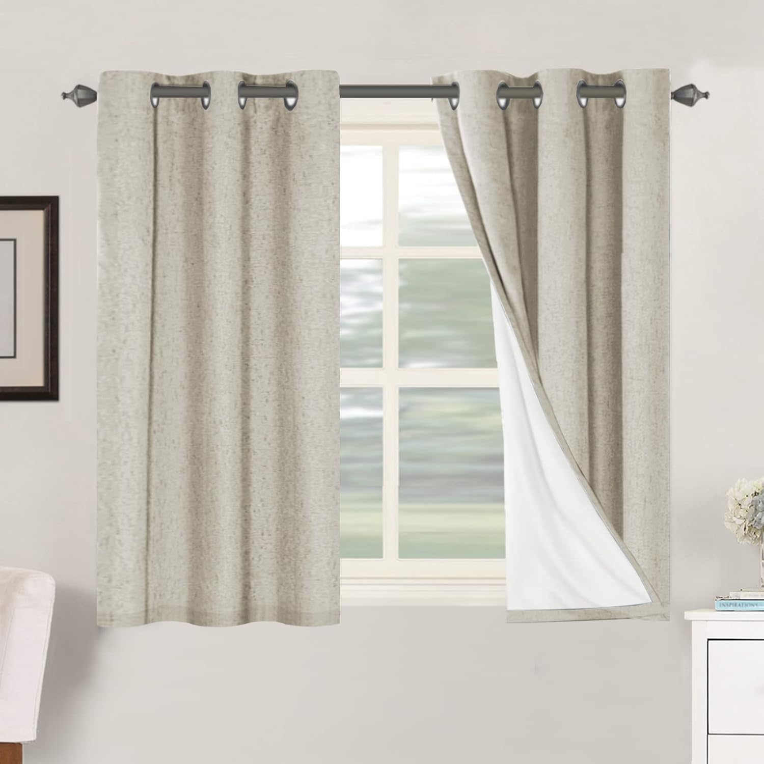 - 100% BLACKOUT: These elegant faux linen curtain is passed GLOBAL RECYCLED STANDARD certificate, has white color lining on backing, definitely can block out 100% bright sunlight and UV ray, turn day into night, just enjoy your sweet sleeping and protect your furniture from color fading, providing entire privacy in your place