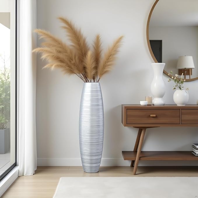 Tall Floor Vase, 27.5 inches (70cm, 2.3FT) Tall Vases Sturdy, Luxury, Textured for Decorative Branches Dried Flowers, Floor Vase for Rustic Living Room, Modern Decor, Resin Silver Vases