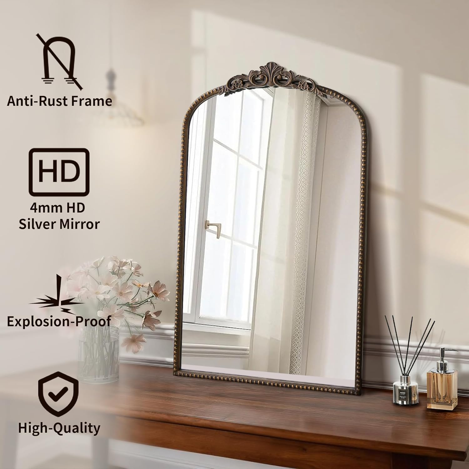 - ๐๐๐ฌ๐ฒ ๐ญ๐จ ๐๐๐ง๐ - The decorative mirror comes equipped with two hooks at the back with all the accessories that you need, making it a breeze to securely hang on any wall and it can effortlessly lean against the wall for added convenience.