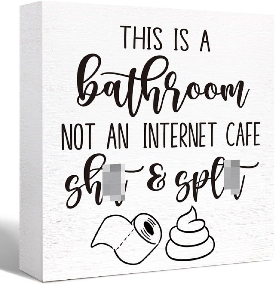 - [Funny Bathroom Quote Wooden Block Sign]: Our bathroom wooden block decor is printed with funny bathroom saying and rustic design add some humor to your bathroom with this vintage farmhouse style freestanding wood box sign.Humorous manner and the entertaining quotes are fantastic mood-boosters, Hilarious Bathroom Entertainment for you and your guests,where no one can hold back the laughter.