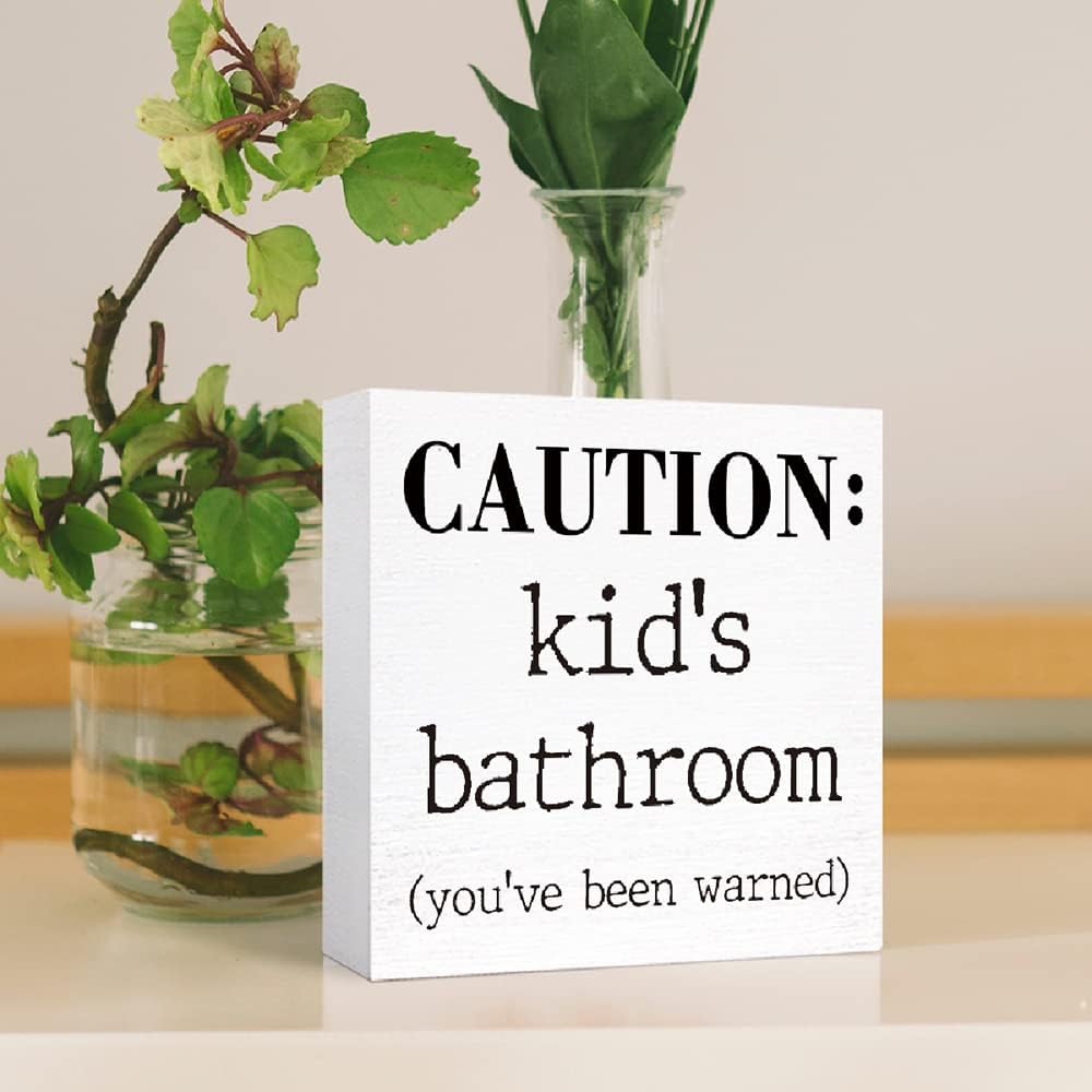 Kids Bathroom Sign Wood Block,Funny Kid's Bathroom Caution Wood Block Sign for Kid Washroom Shelf Toilet Restroom Shelves Decor 5"L x 5"W x 1.1"H