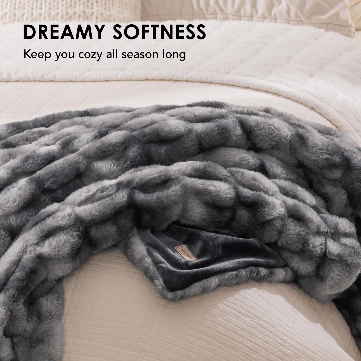 EVERGRACE Luxurious Soft Faux Rabbit Fur Throw Blanket, Cozy Fuzzy Plush Warm Throws for Couch Bed Sofa Chair Home Decor, Ruched Bubble Fluffy Blanket with Reversible Velvet, 60" x 80", Gray