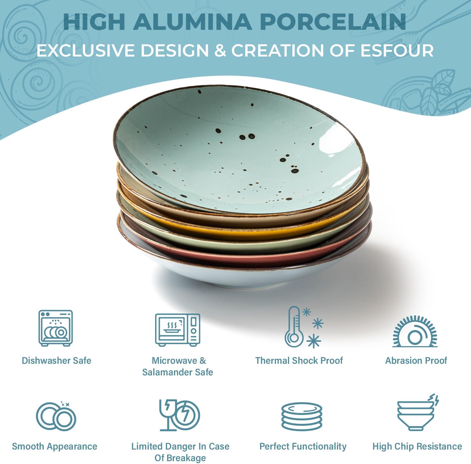 Esfour Ceramic 7.84 Inch Serving Bowls - Set of 6 | 20 Oz Large Pasta Salad Bowls, Microwave/Oven Safe, Wide Shallow Porcelain Bowls for Party, Dinner, Entertaining, Stackable - Vivid Assorted Colors