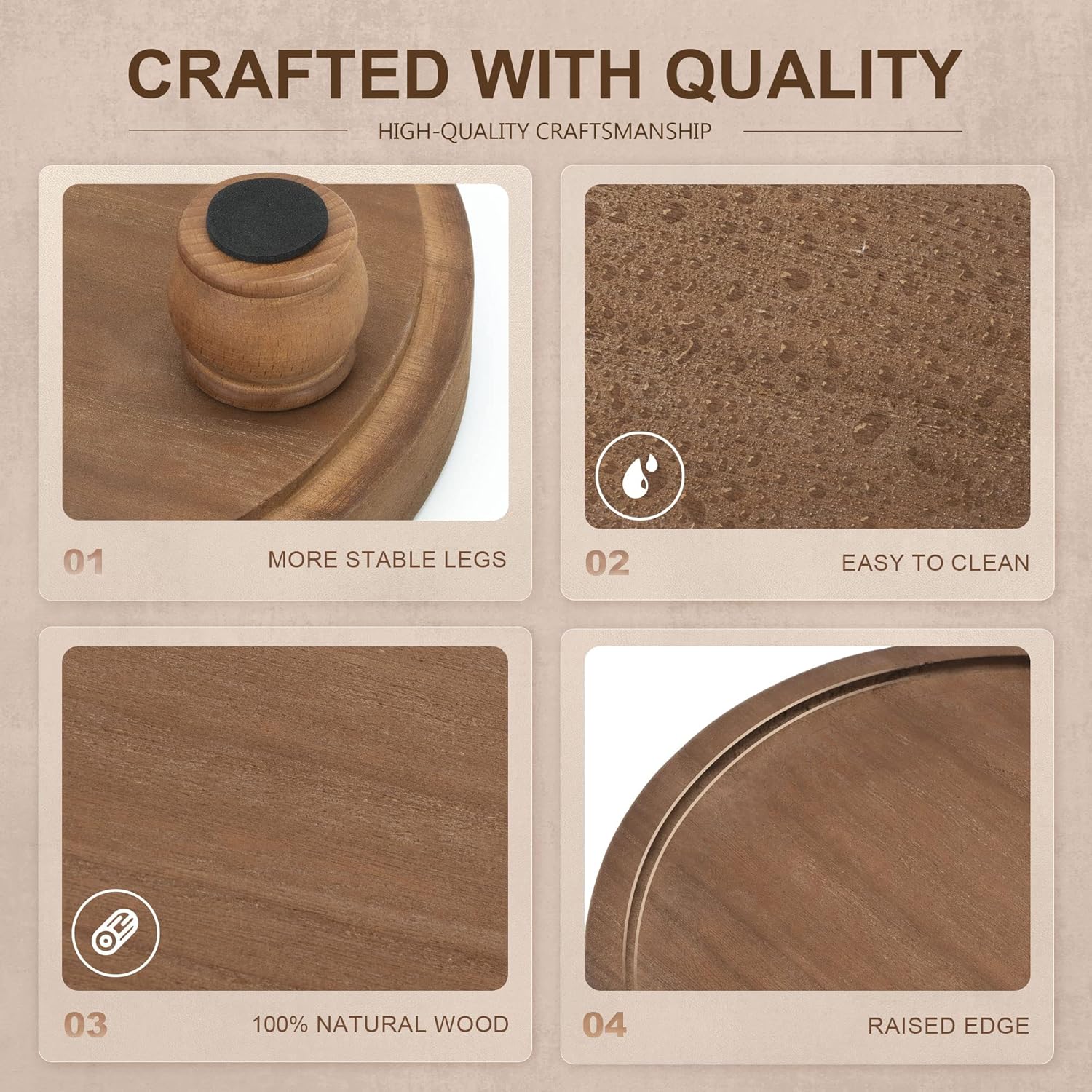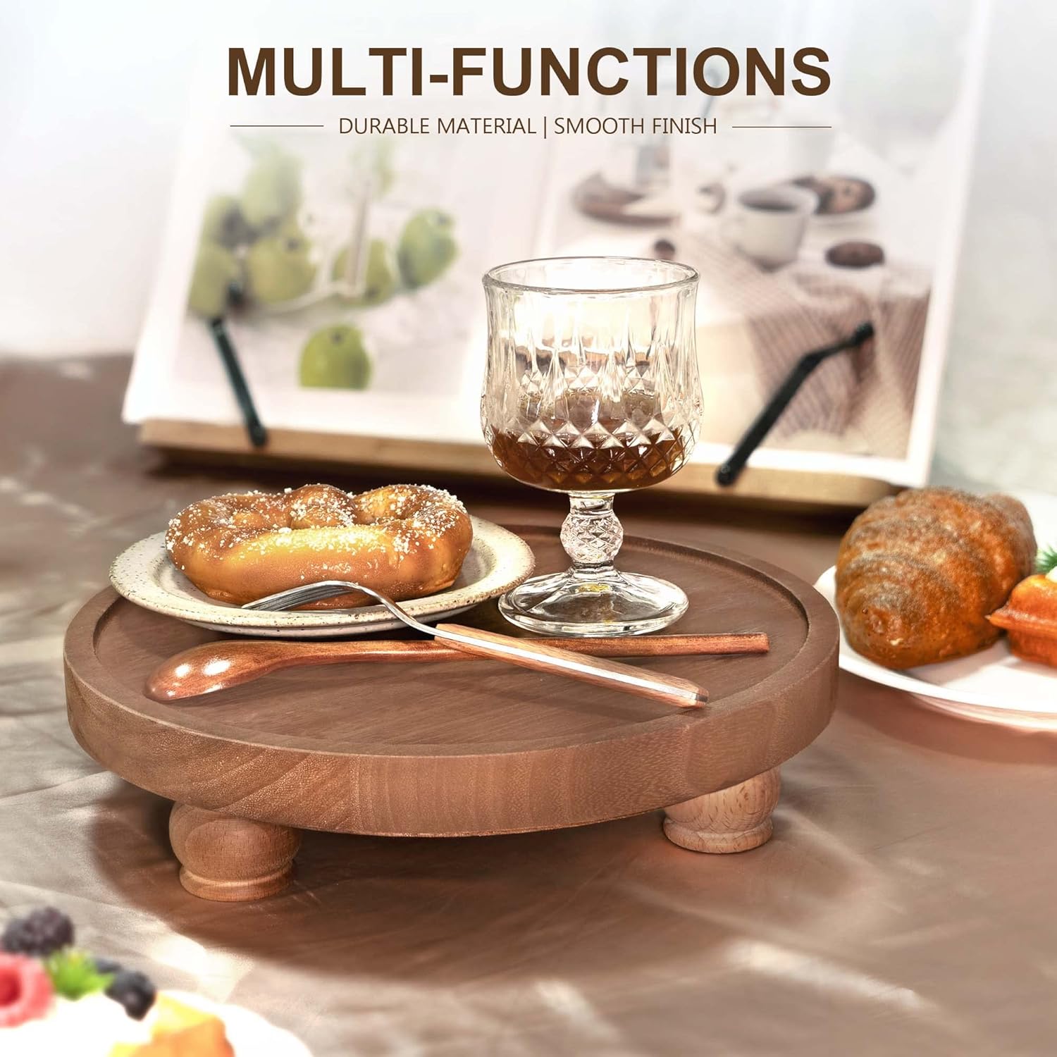 - [DECORATIVE WOOD DISPLAY STAND] The decorative wood display stand features raised edges to prevent items from slipping off. It comes with 3 round bases to keep it away from wet surfaces and avoid scratching countertop. Each leg is equipped with slip-resistant pads for added stability.