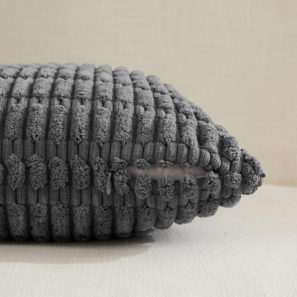 Fancy Homi Dark Grey Lumbar Decorative Throw Pillow Covers 12x24 Inch for Living Room Couch Bed Sofa, Rustic Farmhouse Boho Home Decor, Soft Striped Corduroy Rectangle Cushion Case 30x60 cm