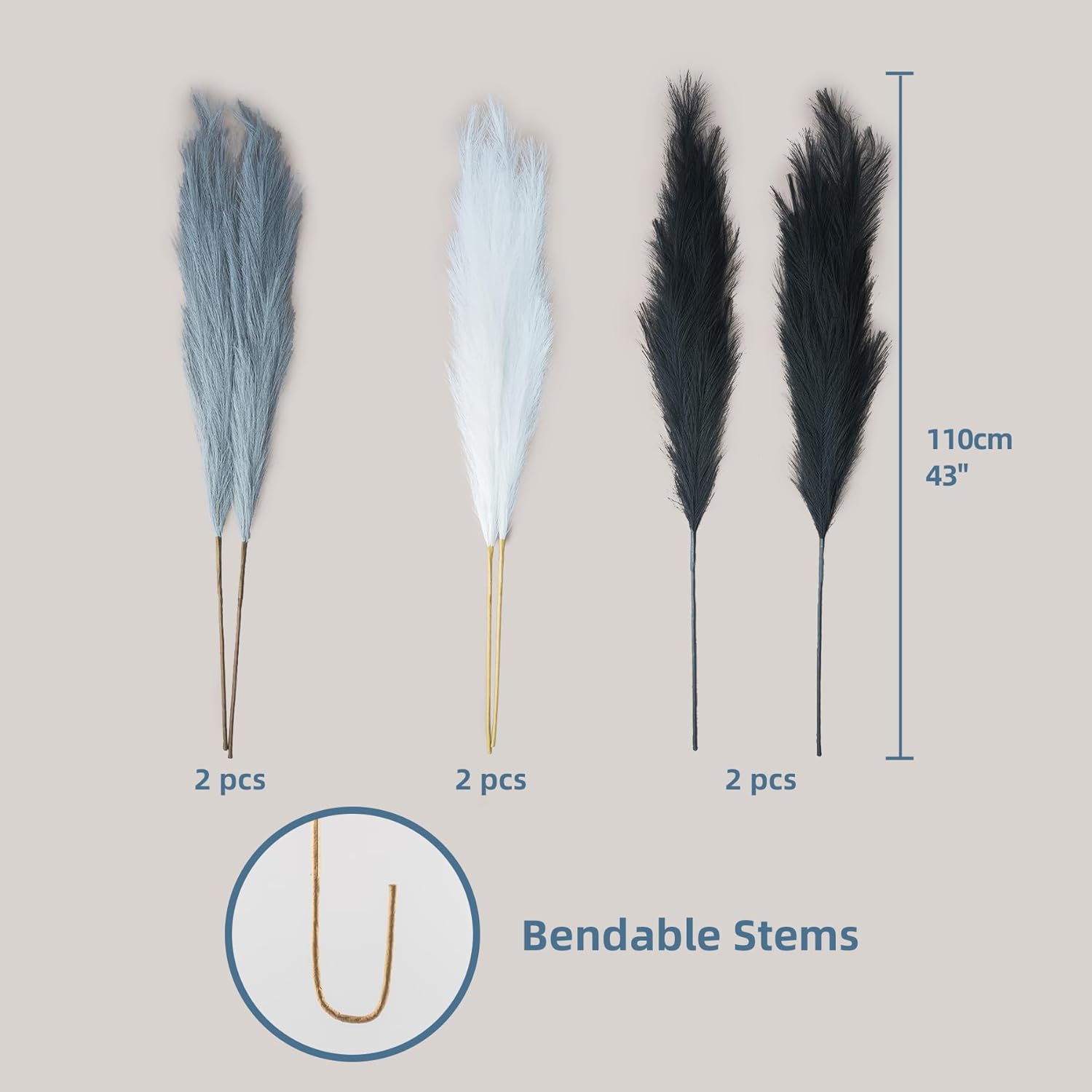 - High End Looking Faux Pampas Grass: It's actually made of a metal wire in the stem and silk feather, it holds shape very well. The pompass grass branches tall bulk is really soft and feather-like, with 18 branches on each stem, and the heads of each stem are designed so you can fluff them up for a fuller look