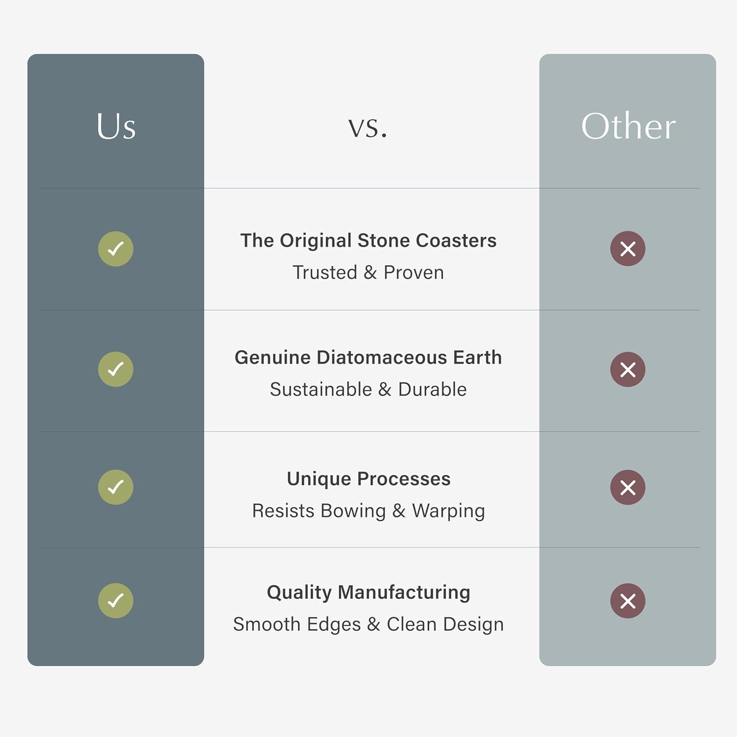 - HOME MUST HAVES: Ideal for cold or hot drinks, our drink coasters guard against scuffs, scratches, splashes, and the dreaded water ring. Bid farewell to damp tile coasters and wet countertops, and enjoy the convenience and protective power our stone coasters offer.
