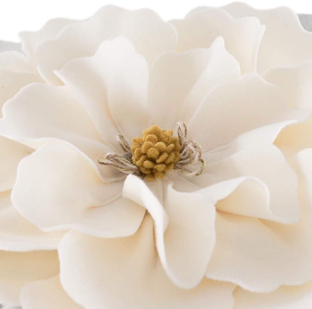 - ELEGANT DESIGN: At the center of the pillow's design is a large, white flower. The flower is crafted with multiple layers of petals, giving it a full and lush appearance. The petals are neatly arranged, creating a sense of symmetry and order. The flower's center is a bright yellow stamen, which contrasts beautifully with the white petals, drawing the viewer's eye and adding a pop of color.