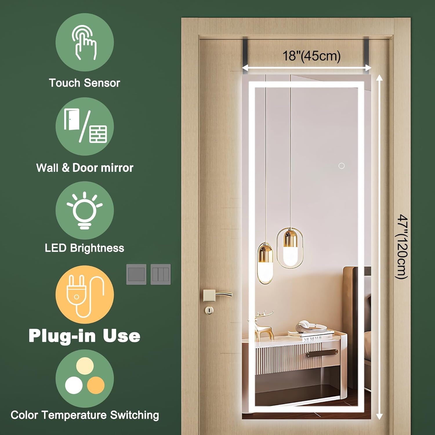 Hasipu LED Door Mirror Full Length, 47 x 18 Inch Full Body Wall Mirror Over The Door Hanging Mirror for Bedroom, Living Room, Cloakroom Right Angle
