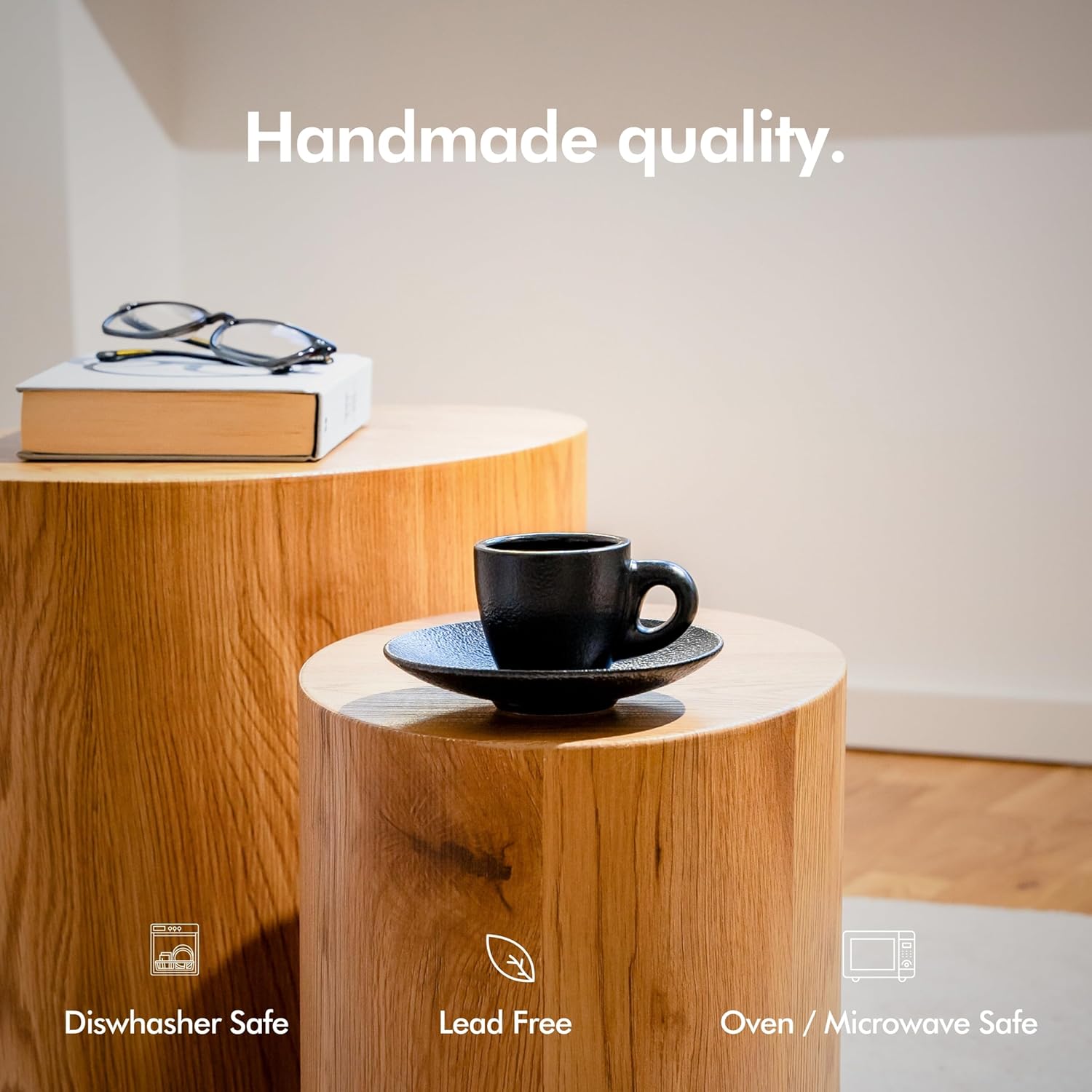 KIVY 3 oz Espresso cups set of 4 - Thick walled stoneware espresso cup set - Italian style cups and saucers - Demitasse cups set of 4 - Espresso mugs black - Coffee shot cups & saucers