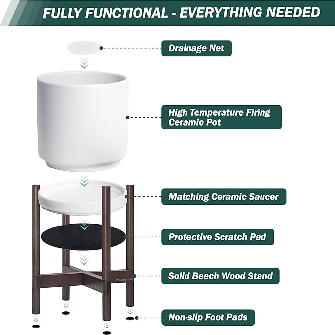 - A Complete Set: Mid-century ceramic planter, combined with a solid beech wood stand that match perfectly together and looks great in anywhere.