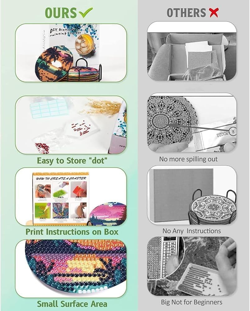 - 【Easy to Apply】: This set of drink coasters is very easy to complete. First peel off the protective film and glue the corresponding diamond on the coaster according to the number/letter on the coaster. Finally, you will get a durable diamond painting coaster of your own making.