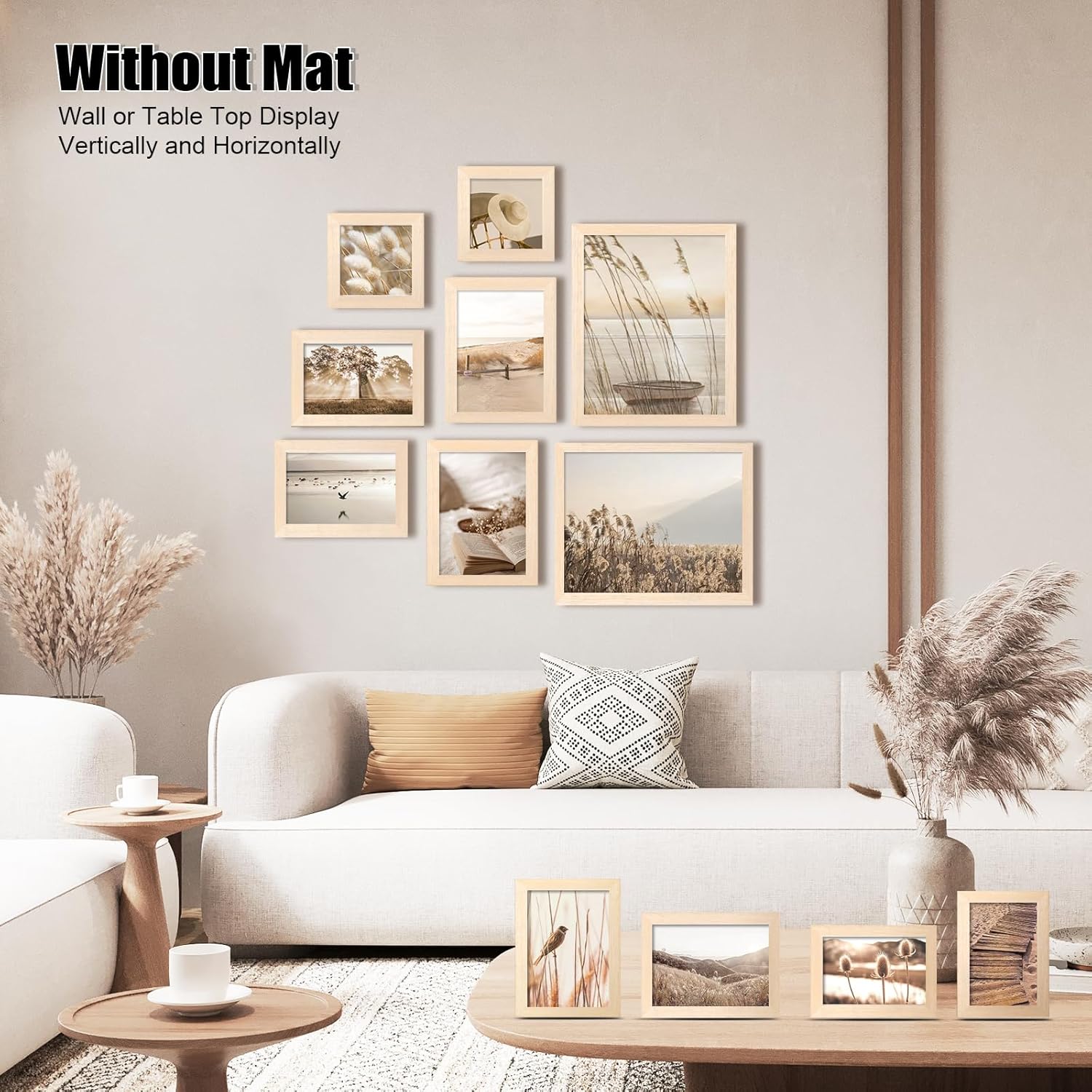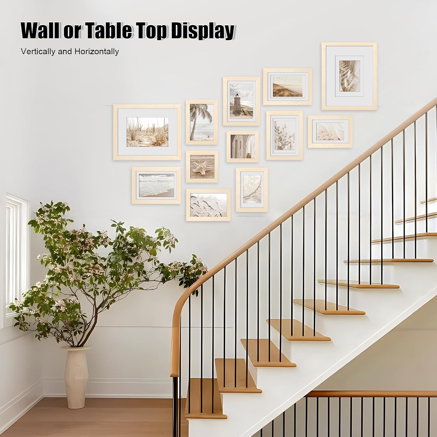 - 12 Set Natural Wood Picture Frames: This 12 pack of natural wood photo frames includes (2) 8x10 picture frames with 2 mats for 4x6 and 5x7 pics; (4) 5x7 picture frames with 2 mats for 4x6 and 3.5x5 pics; (4) 4x6 picture frames with 1 mat for 3.5x5 pics; (2) 4x4 picture frames; Perfect for you creating a gallery wall.