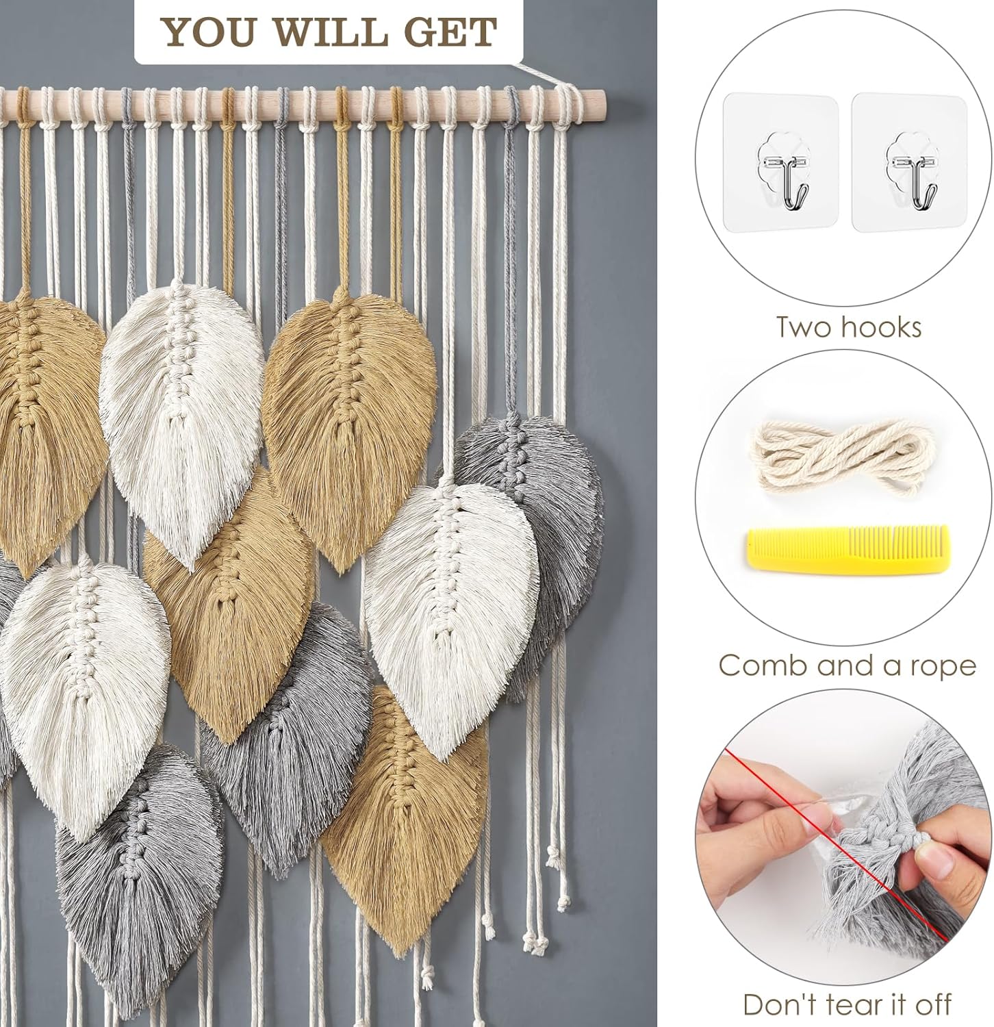- 【Boho Wall Art Decor】: Unique boho room decor, this meticulously woven wall hanging macrame with beautiful weaving leaves is made of natural rope, which knotted on the wooden dowel. With a neutral color palette, this macrame wall hanging makes a soft and calming statement to any space.