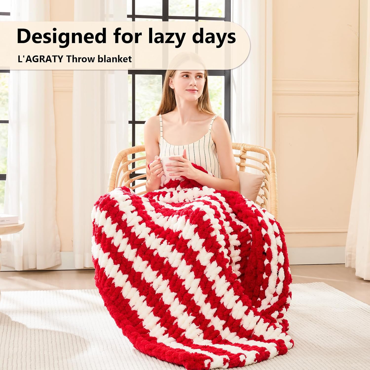 L'AGRATY Chunky Knit Blanket Throw - Soft Chunky Throw Blanket 40x50: 100% Hand Kintted Chenile Crochet Throw Blanket for Couch - Large Cable Knit Chunky Blanket for Home Decor(Red and White)