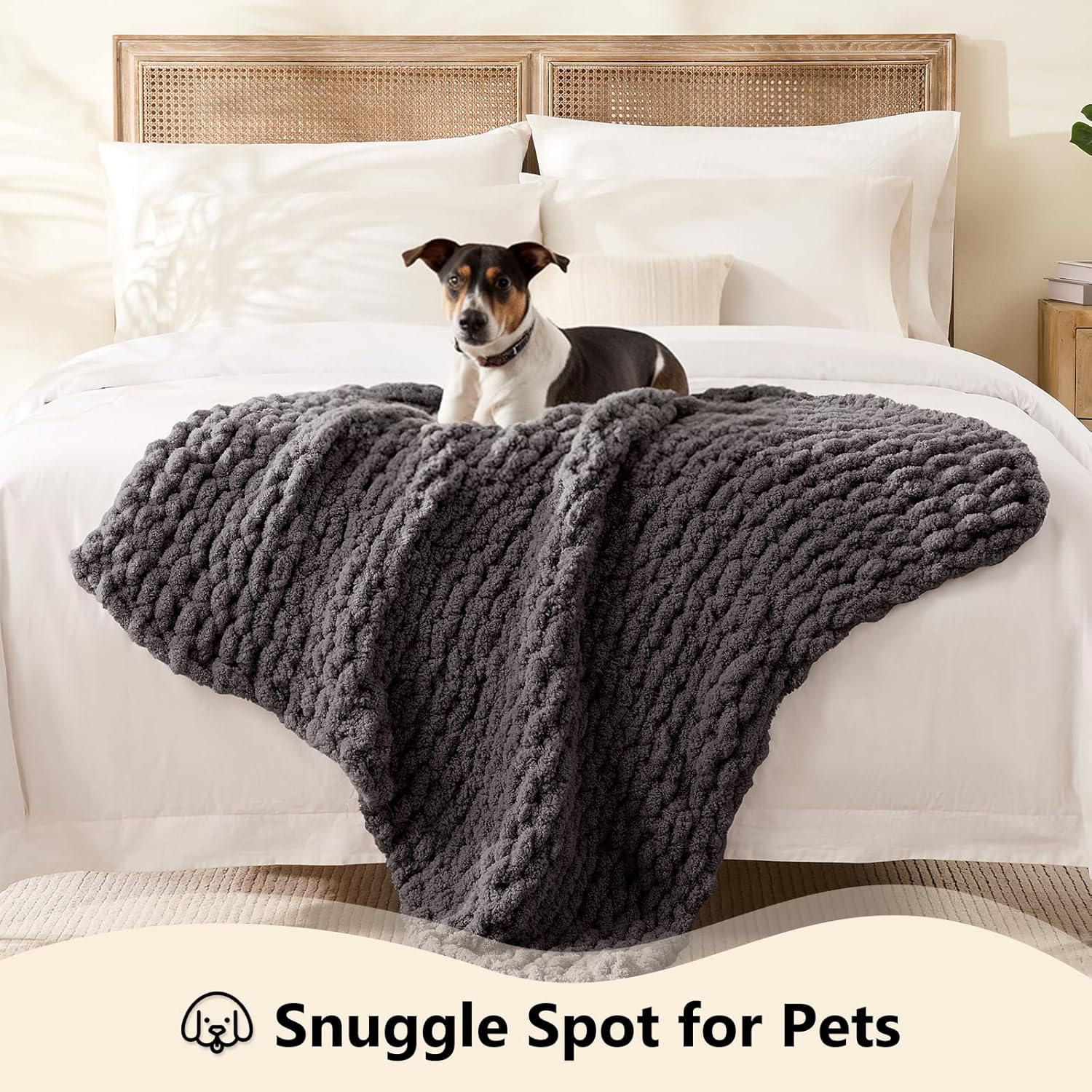 L'AGRATY Chunky Knit Blanket Throw - Soft Throw Blanket 40x50: 100% Hand Kintted Chenile Crochet Throw Blanket for Couch - Large Cable Knit Blanket for Home Decor (Dark Grey)
