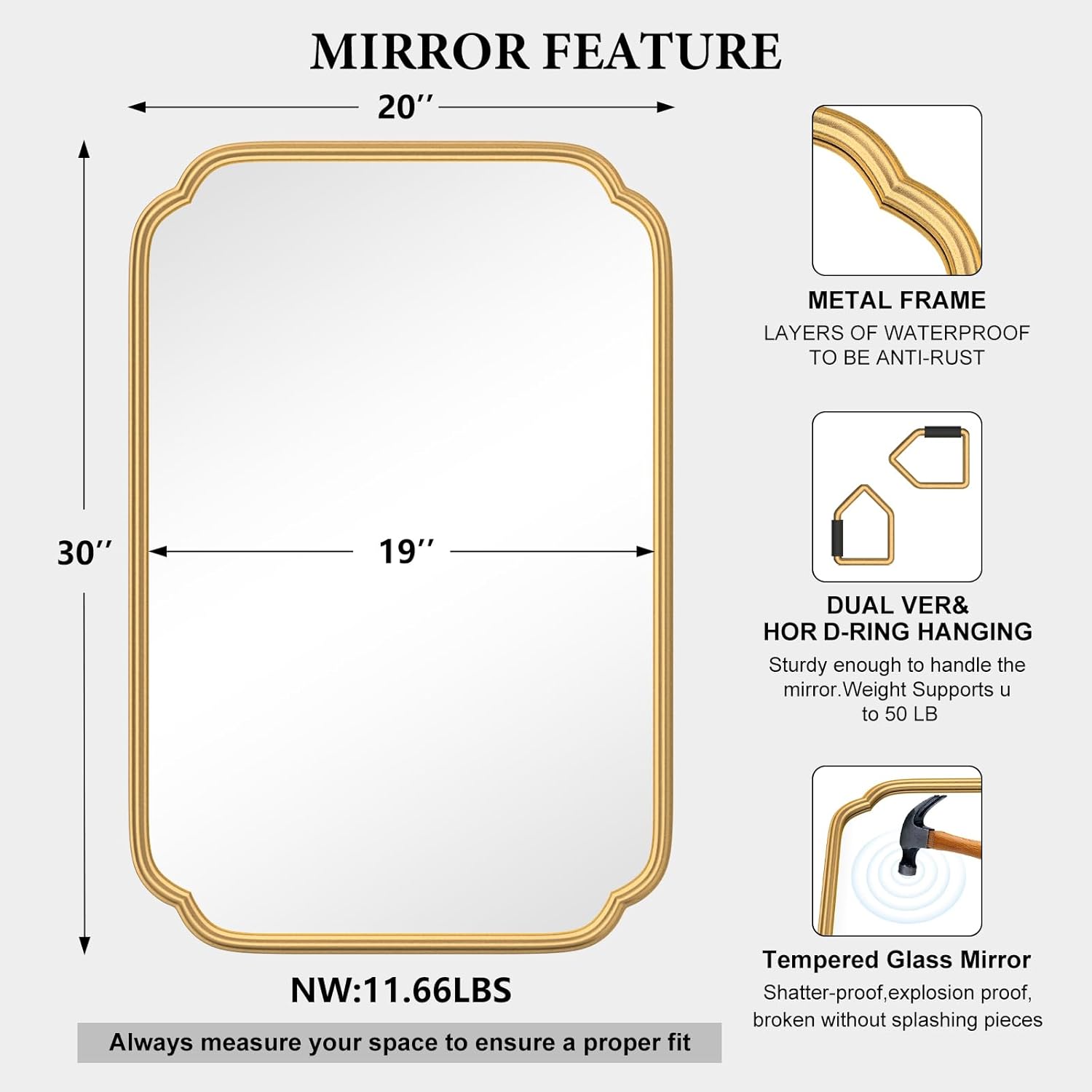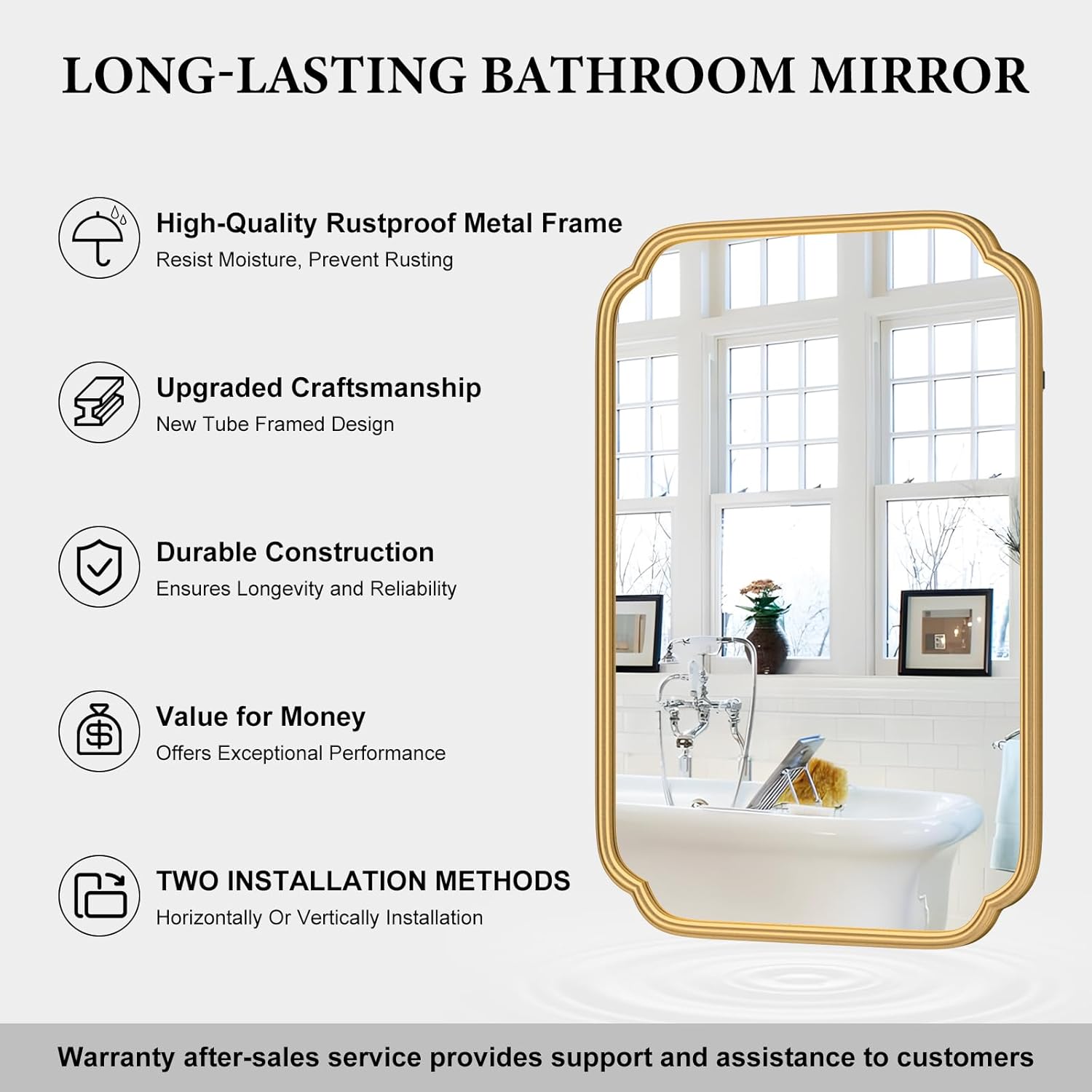 - 【Multi-size Design】Gold wall mirror 20×30 inch. Multi-Size Design offers both gold and black colors for coustomer to choose from. Meets the decor needs to industry, rustic and modern style of bathroom, Multi-scene use for bathroom,bedroom,living room,hotel or salon.