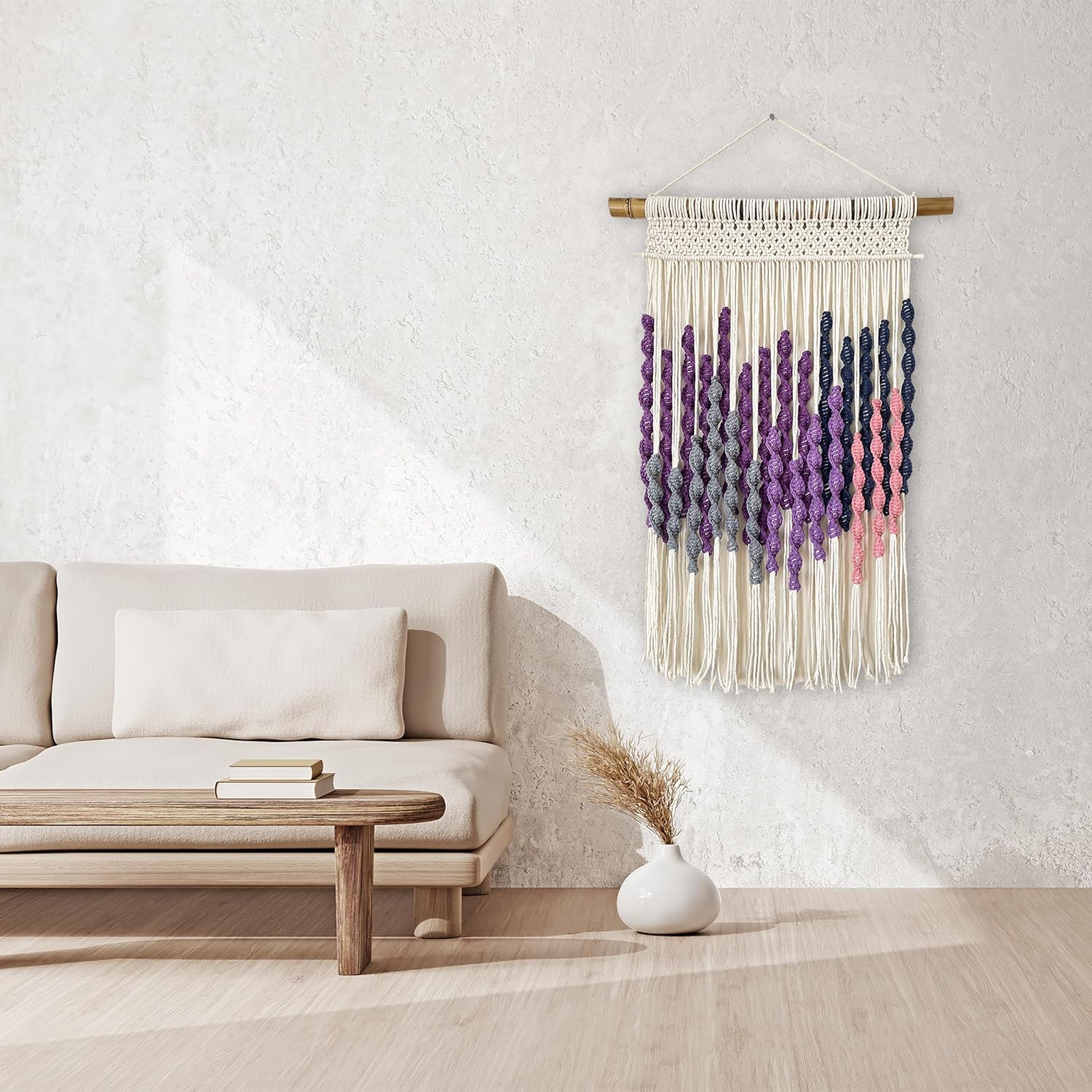 Knots & Beyond Purple Macrame Wall Hanging with Driftwood Dowel, Bohemian Tapestry Wall Art with Rod, Boho Wall Decor Above Bed, 22" x 32"
