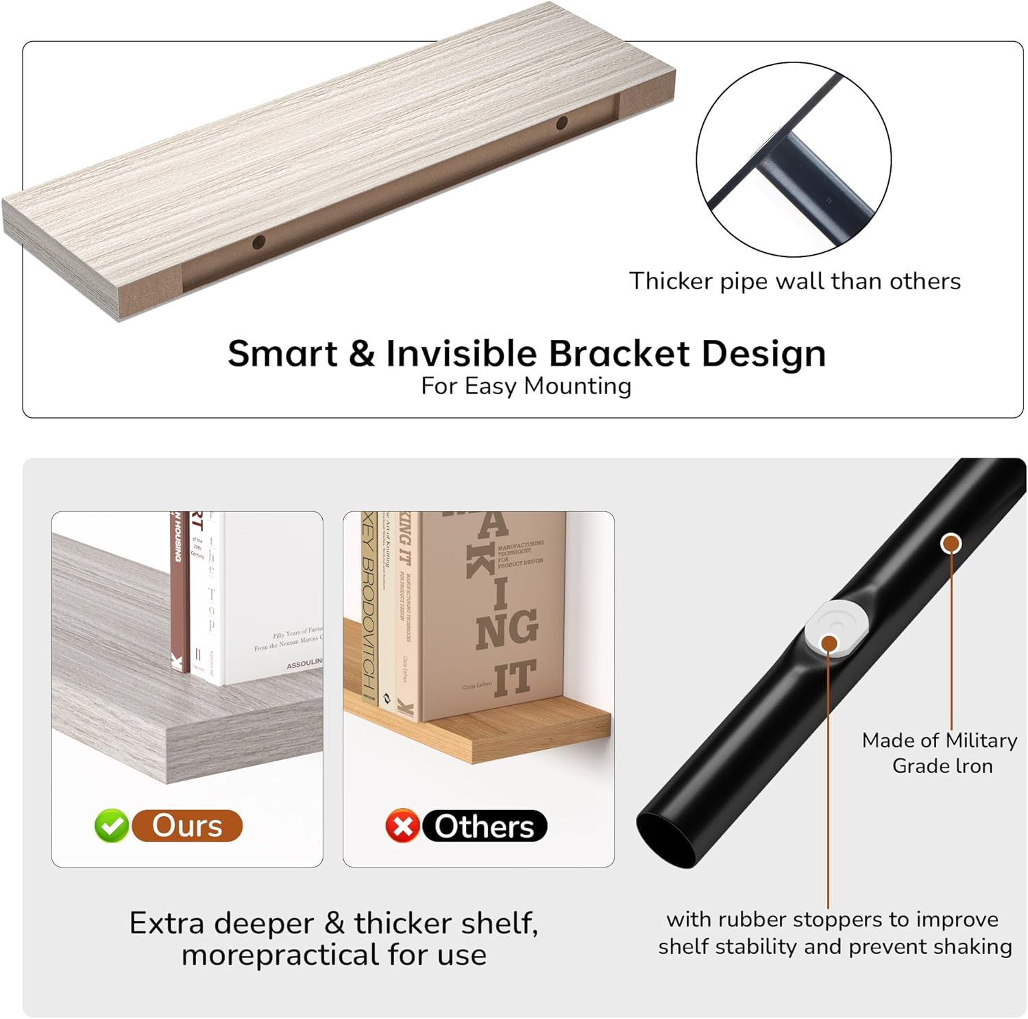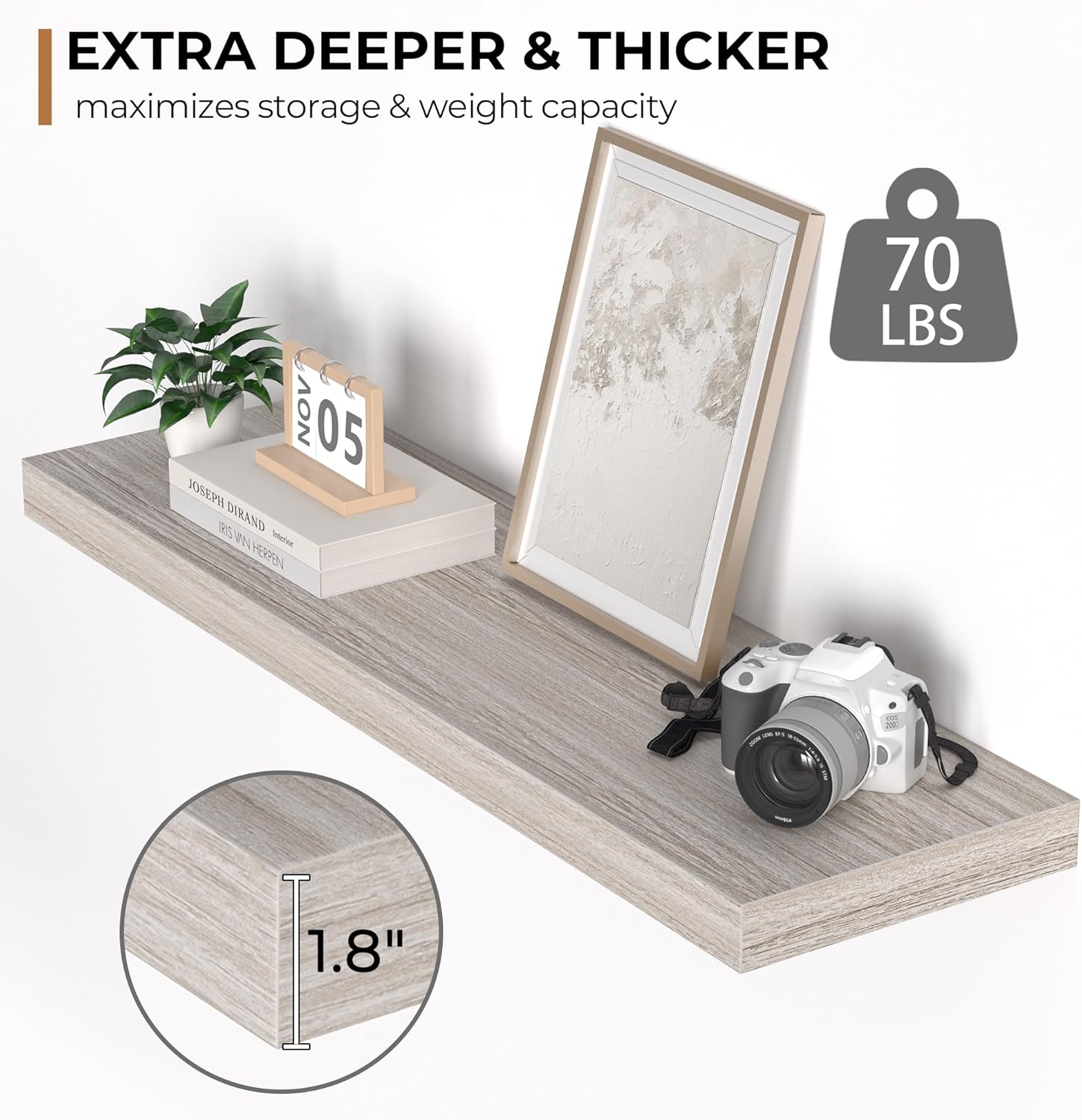 - Extra Deeper & Thicker - This wall shelf measures 36"W x 10.23"D x 1.8"H. Extra deeper and thicker design in order to bring maximizes storage space and weight capacity, even hold up to 70 lb. This floating shelf taking up zero square feet, reduces clutter and highlights décor in compact spaces.
