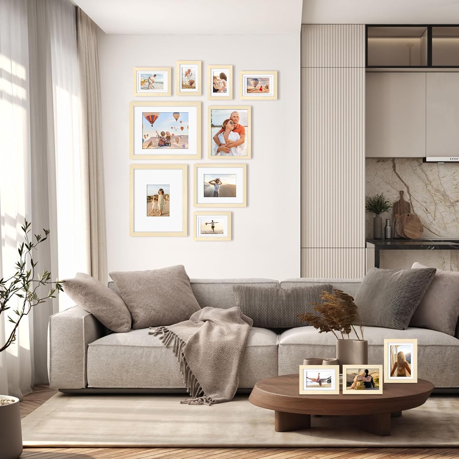 - 12 Set Natural Wood Picture Frames: This 12 pack of natural wood photo frames includes (2) 11x14 picture frames with 2 mats for 5x7 and 8x10 pics; (2) 8x10 picture frames with 2 mats for 4x6 and 5x7 pics; (4) 5x7 picture frames with 2 mats for 3.5x5 and 4x6 and pics; (4) 4x6 with 2 mats for 3x4.5 and 3.5x5 pics picture frames; Perfect for you creating a gallery wall.