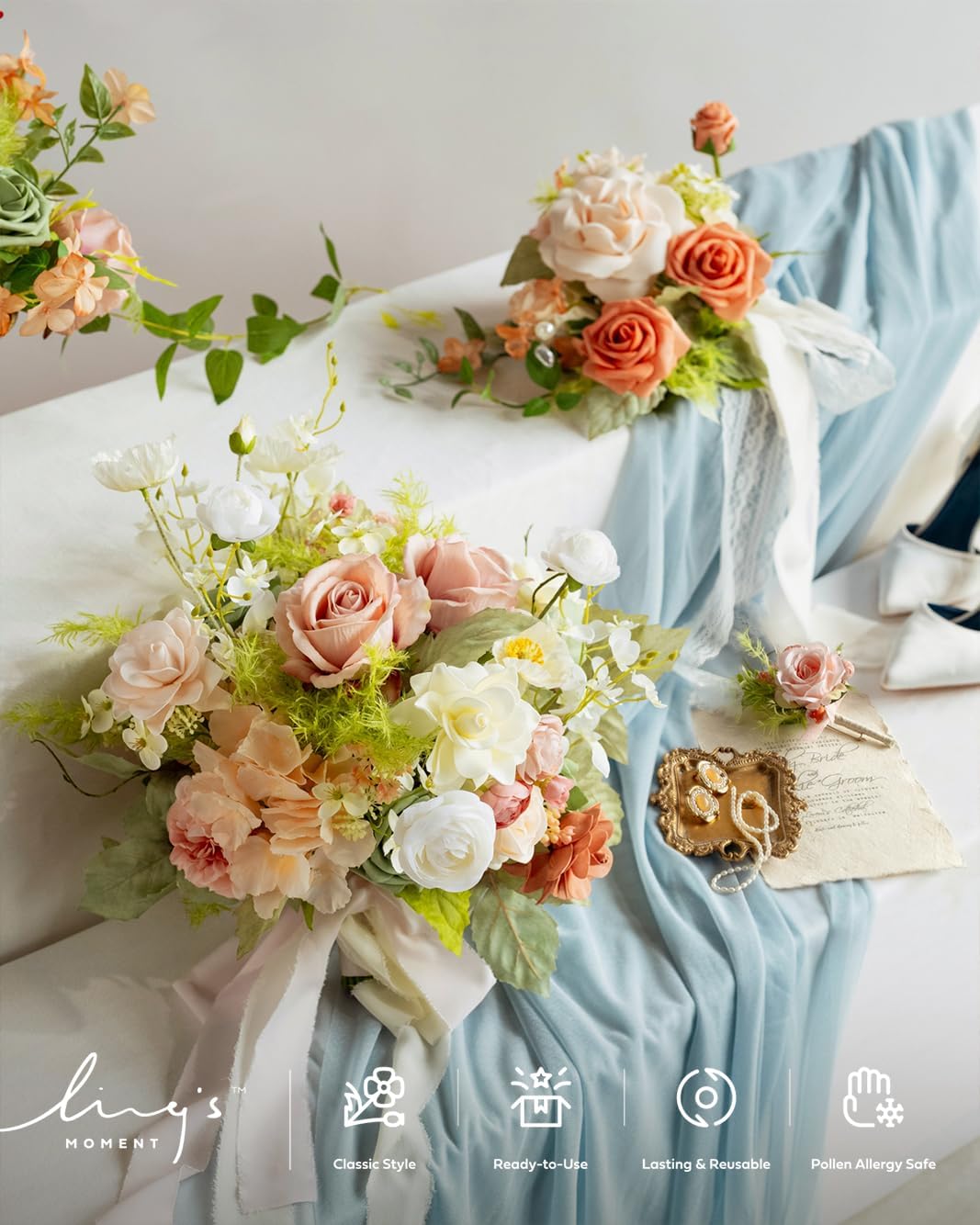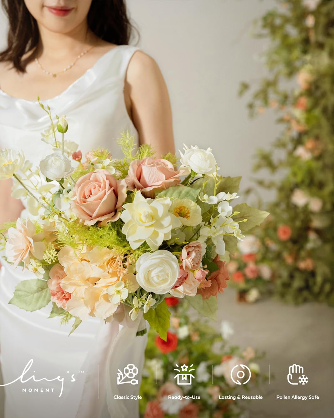 - OLOR INSPIRATION & VERSATILITY: Step into a secret garden with Ling's Garden Blush wedding collection! It’s perfect for both indoor and outdoor wedding ceremonies in any weather, bridal showers, and photoshoots. It can be used as a fall bridal bouquet, bridesmaid bouquet, toss bouquet, or a prop for wedding photography.It can also be displayed in a vase as part of your home decor.