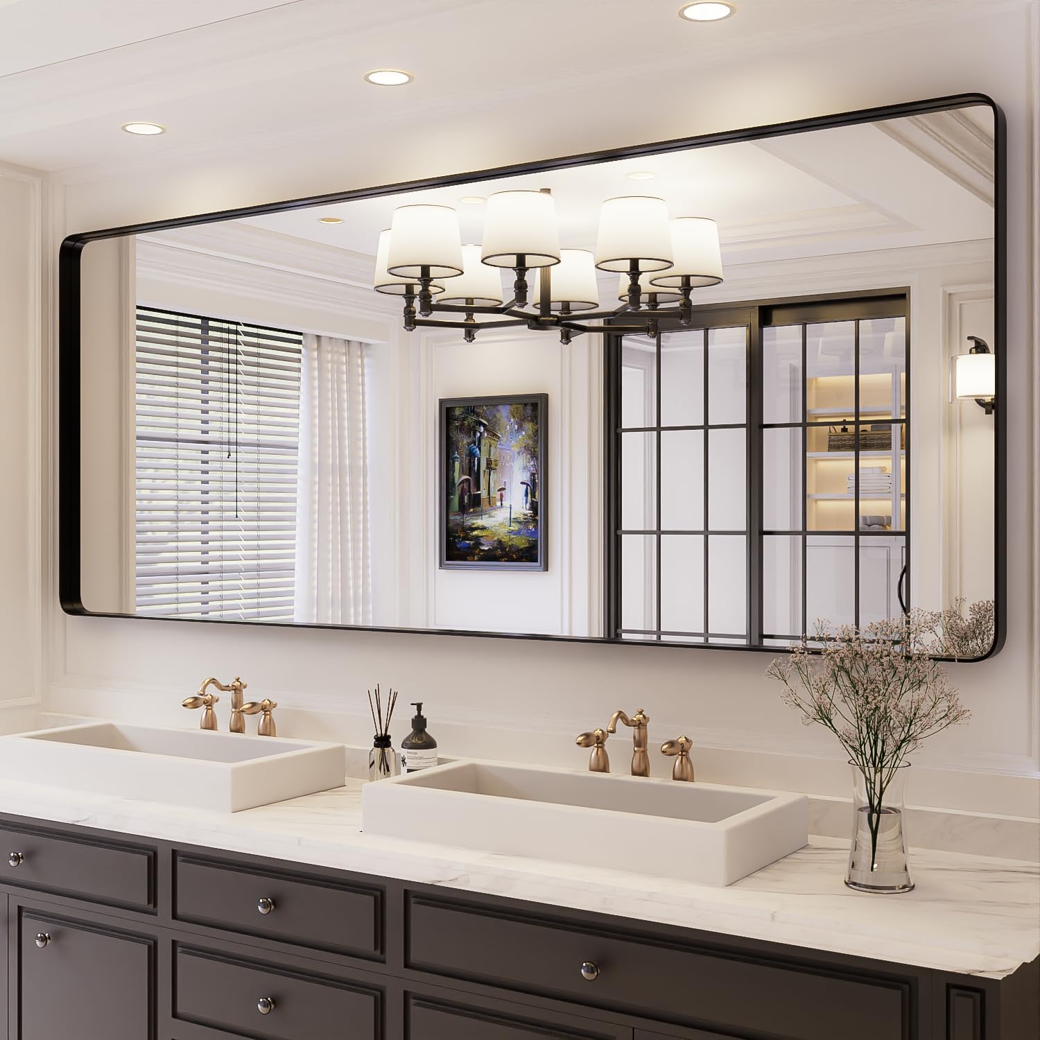 ISKM Black Framed Mirror for Wall 84"x 32", Large Bathroom Mirror Anti-Rust, Tempered Glass, Rounded Rectangle Mirror(Horizontal/Vertical)