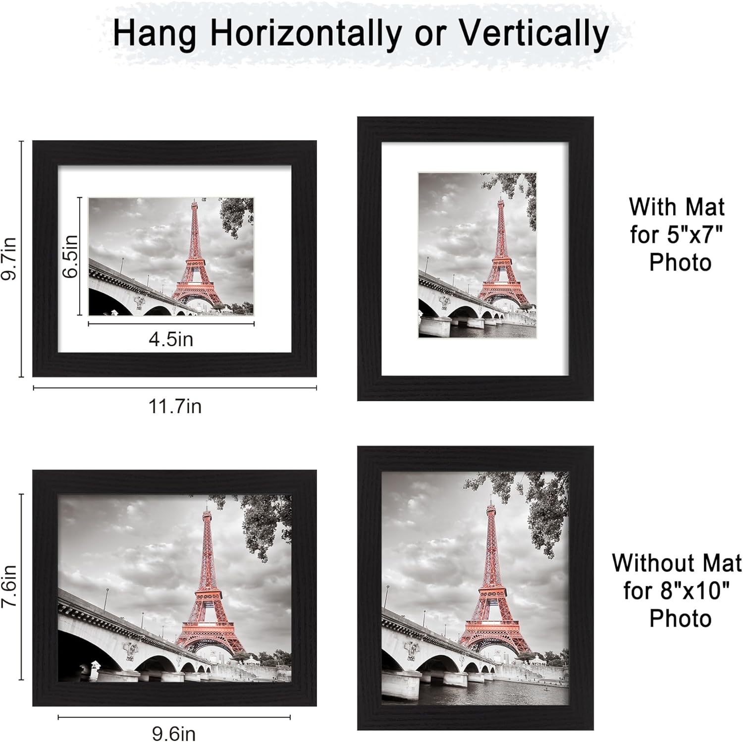 - Double Frames Set: Includes 2 frames in the same size. Perfectly fits 5x7 inch pictures with mat or 8x10 inch without mat. The frame opening display size is 0.5 inches smaller than the photo size for secure mounting.