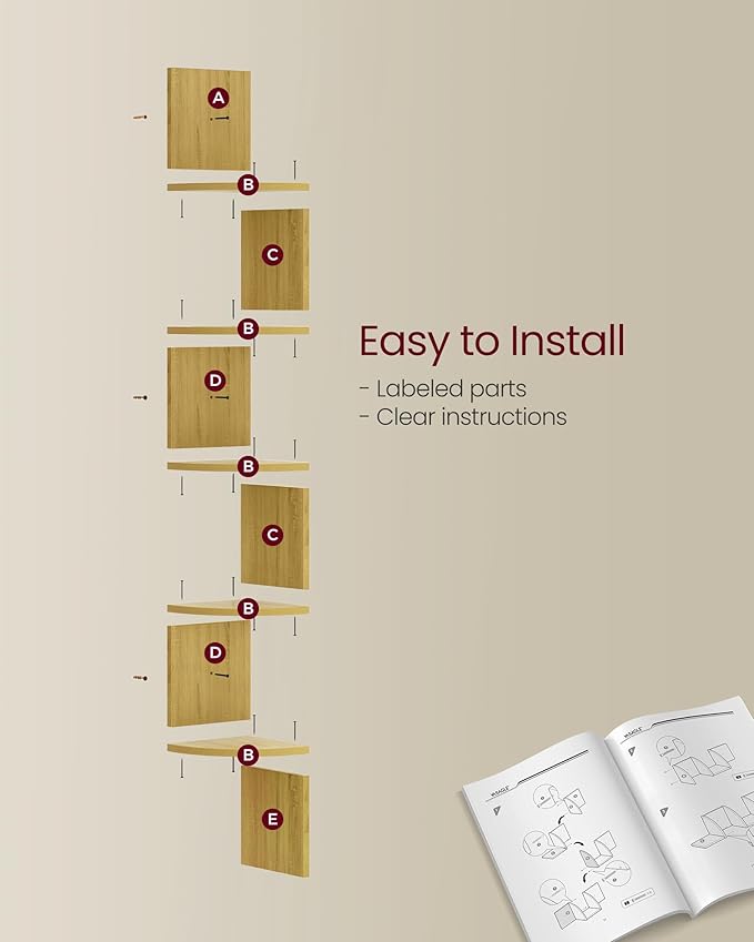 VASAGLE Corner Shelf Wall Mount, 5-Tier Floating Corner Bookshelf, Plant Shelf for Bedroom, Living Room, Bathroom, Home Office, Natural Oak