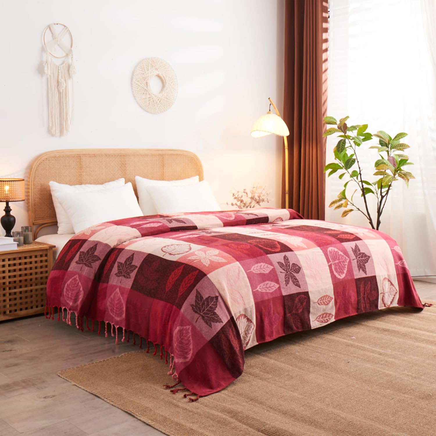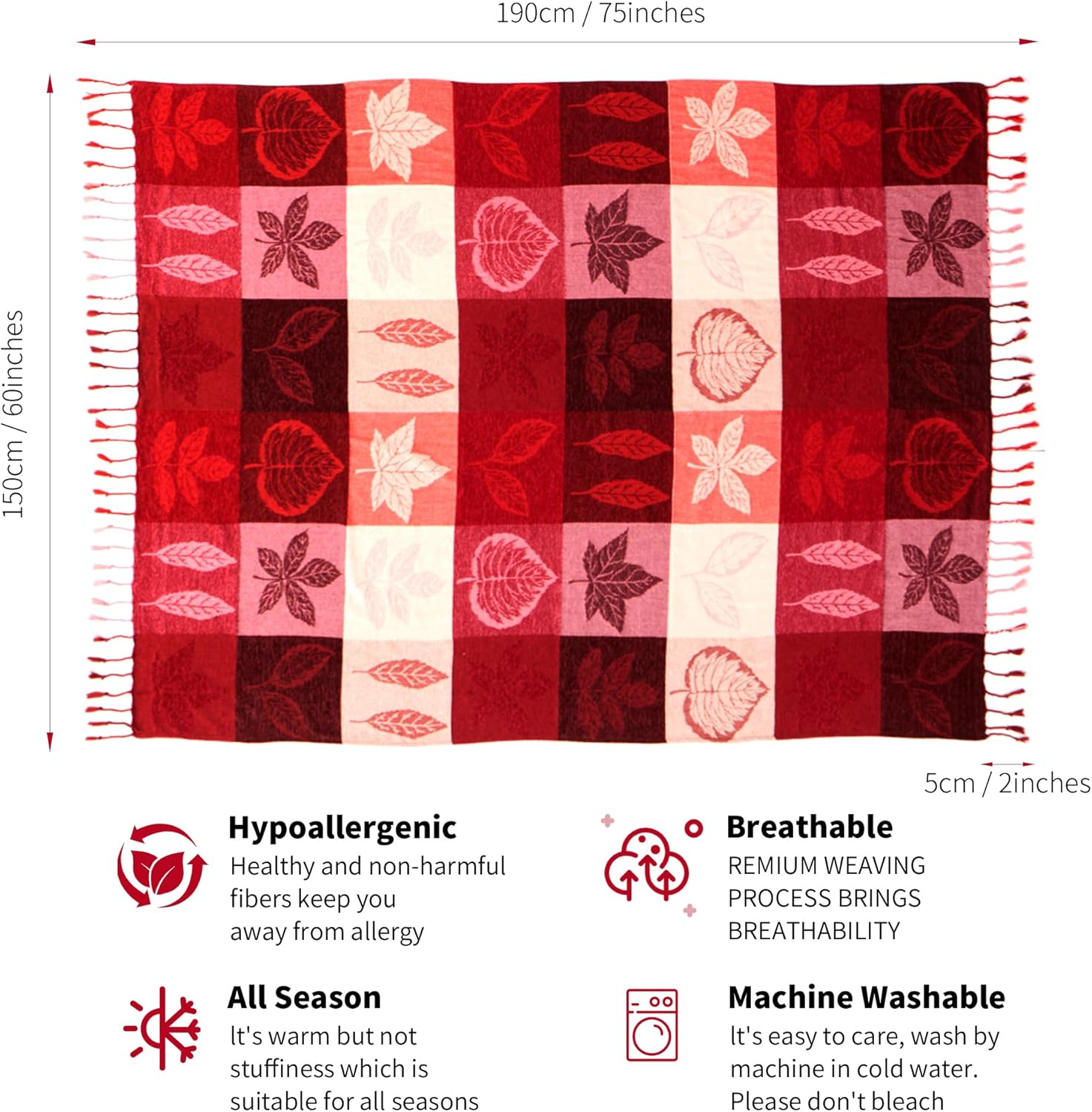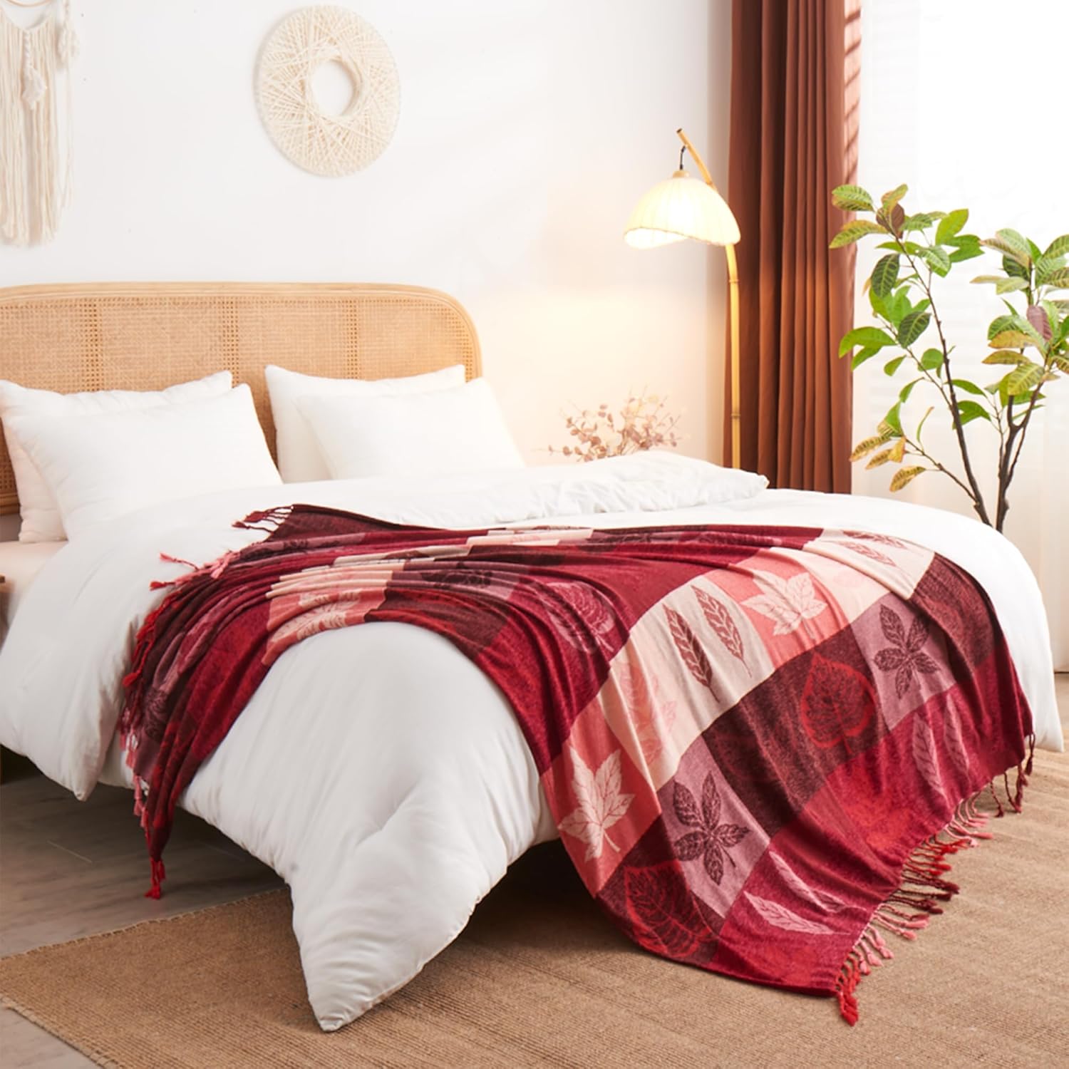 Bohemian Chenille Jacquard Tassel Throws - Reversible Red&Pink Maple Leaf Design for Boho Hippie Vibes - Oversized Blankets for Large Couch, Furniture, Sofa, Chair…