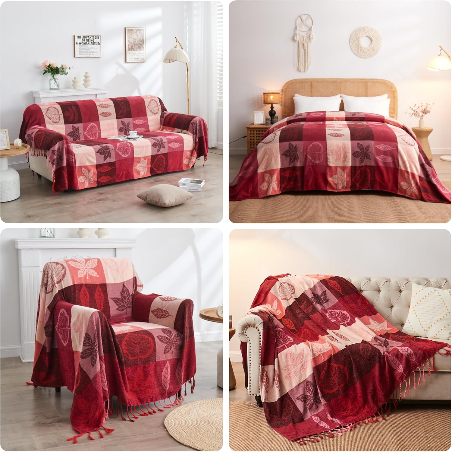 Bohemian Chenille Jacquard Tassel Throws - Reversible Red&Pink Maple Leaf Design for Boho Hippie Vibes - Oversized Blankets for Large Couch, Furniture, Sofa, Chair