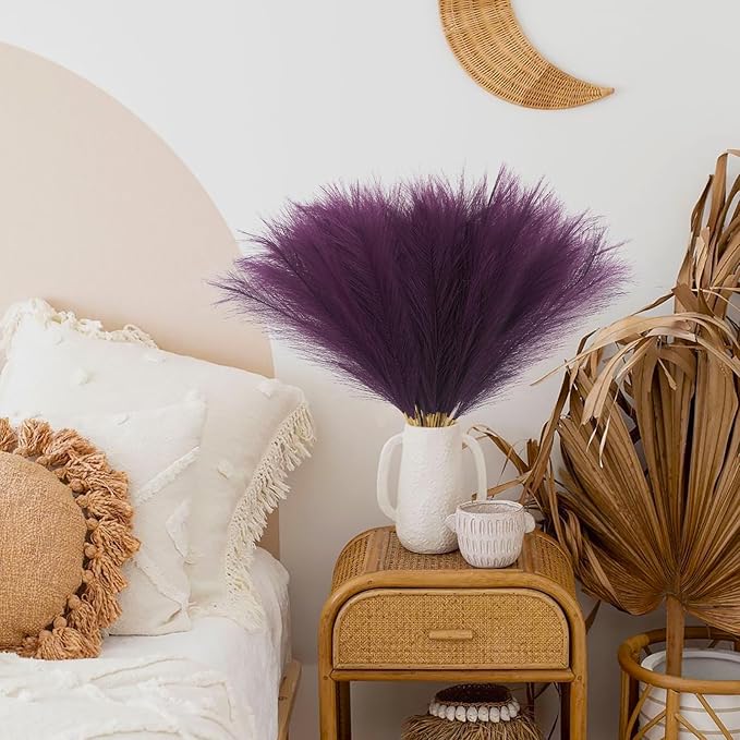 - Purple Pampas Grass Decor: You will get a pack of 50pcs artificial pampass grass, each stem 21.6”, and the heads of each stem is designed you can fluff them up for a fuller look, create a chic minimalist, or Bohemian modern display to complement your existing home arrangement