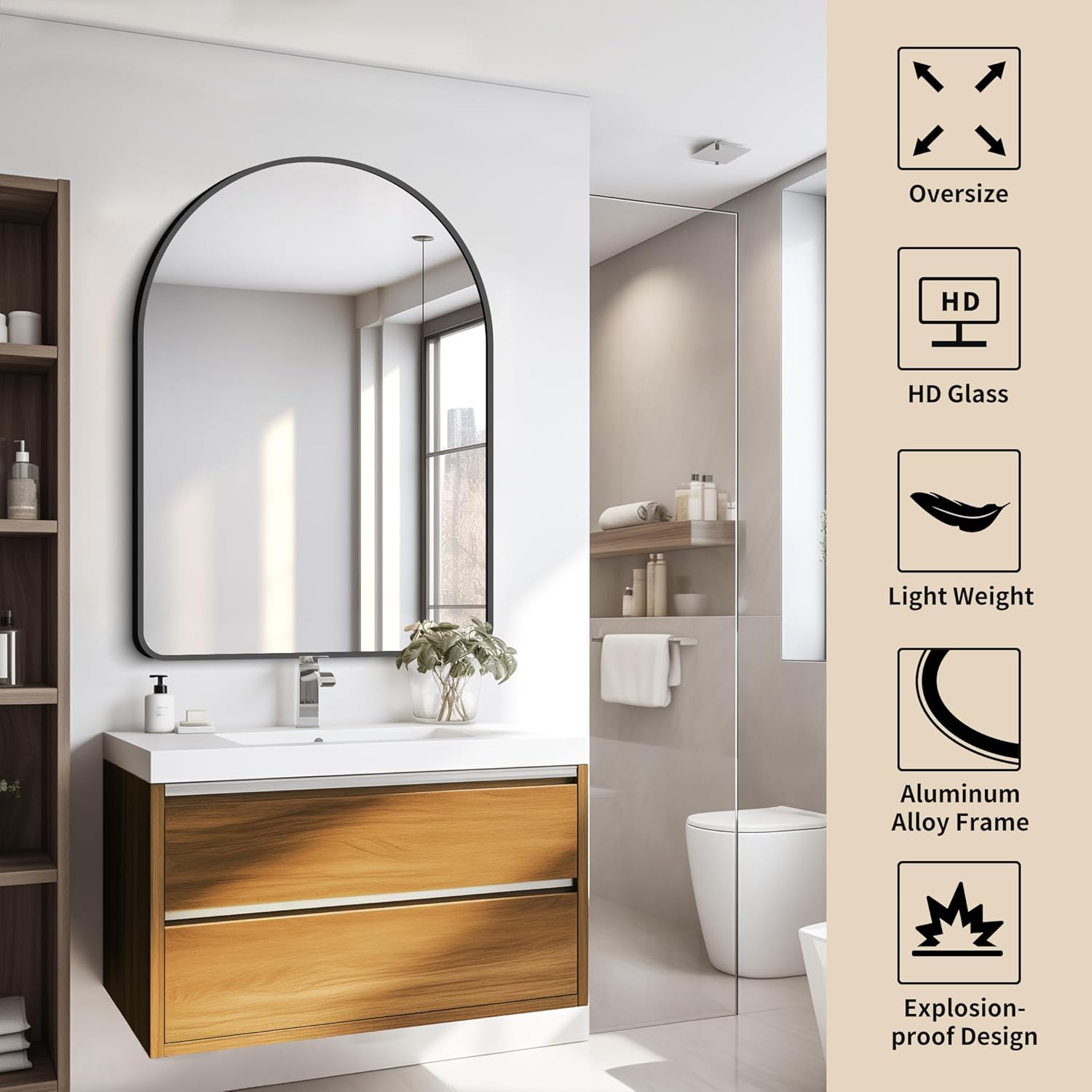- Aluminum Alloy Frame: Our arch bathroom mirror is made of high quality aluminum alloy frame, sturdy and rust-proof. Special anti-corrosion mirror treatment, designed for long time use. And the high-grade aluminum alloy frame also has an anti-corrosive feature. The wall-mounted mirror for the bathroom performs beautifully in every climate.