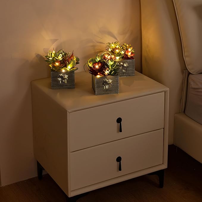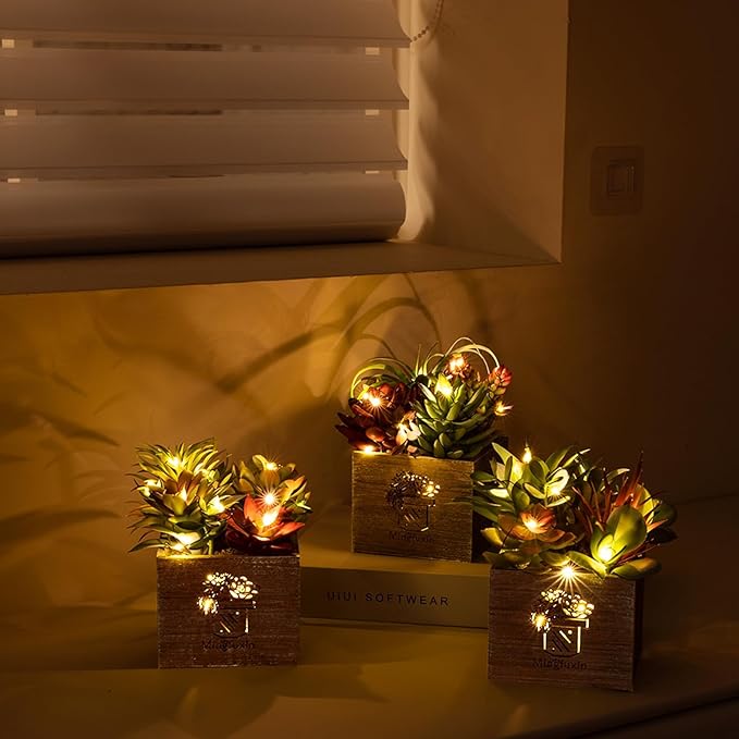 - Low-Maintenance Faux Plants with Lights Decor: Enjoy the aesthetics of faux succulents without the upkeep. Our fake plant decor require no watering, built-in LED string provide a mesmerizing and energy-efficient illumination that lasts for hours, adding a cozy glow to your surroundings